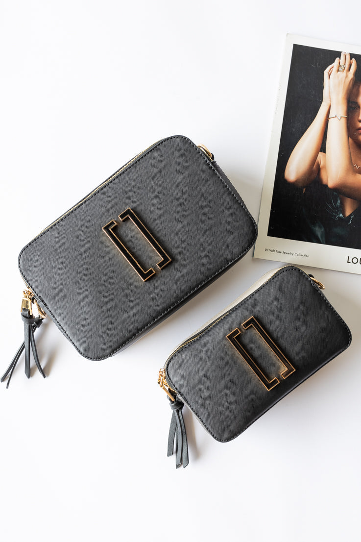 Dai un tocco di stile al tuo look con questa borsa a tracolla Don't Cross Me! Presenta dettagli dorati, un portafoglio abbinato e una tracolla spessa argento e nera rimovibile e regolabile: tutto l'essenziale per un look chic. Non lasciarti sfuggire questo capo perfetto per tutti i giorni.