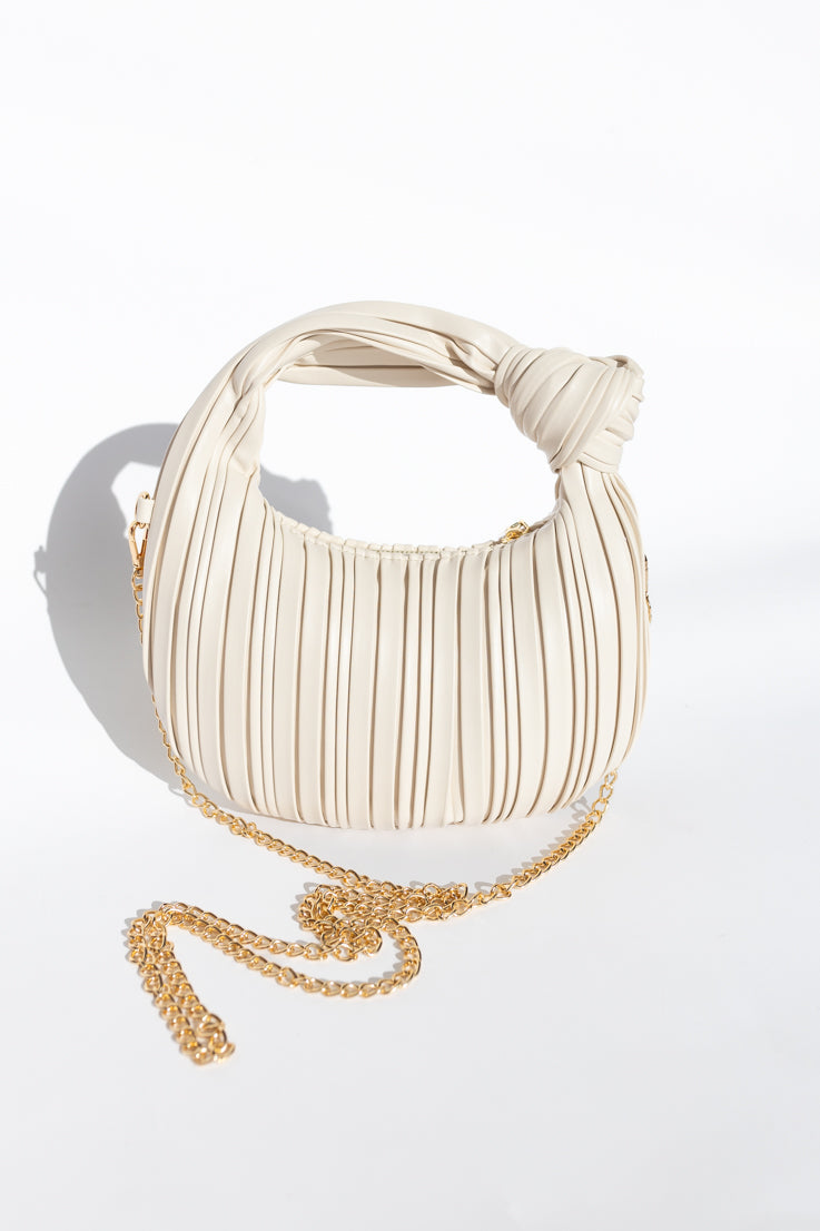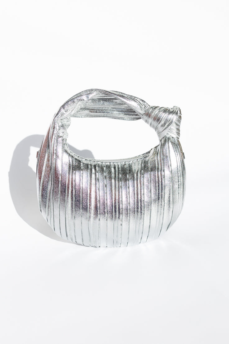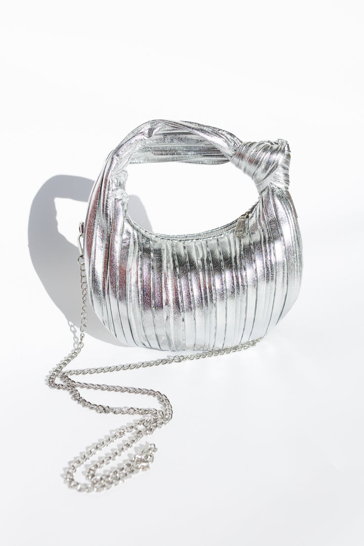 La Wait in Line Bag è una borsa a mano in similpelle che unisce stile e praticità. Con un elegante nodo sul manico e un design testurizzato, è disponibile in due versatili colori neutri: argento o avorio. Inoltre, include una tracolla a catena opzionale in oro/argento per un trasporto a mani libere. Non aspettare oltre e aggiungi questa borsa imperdibile alla tua collezione!
