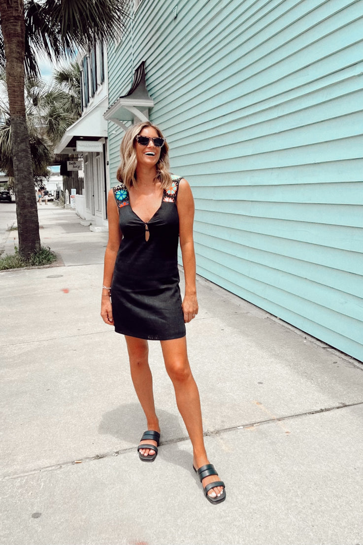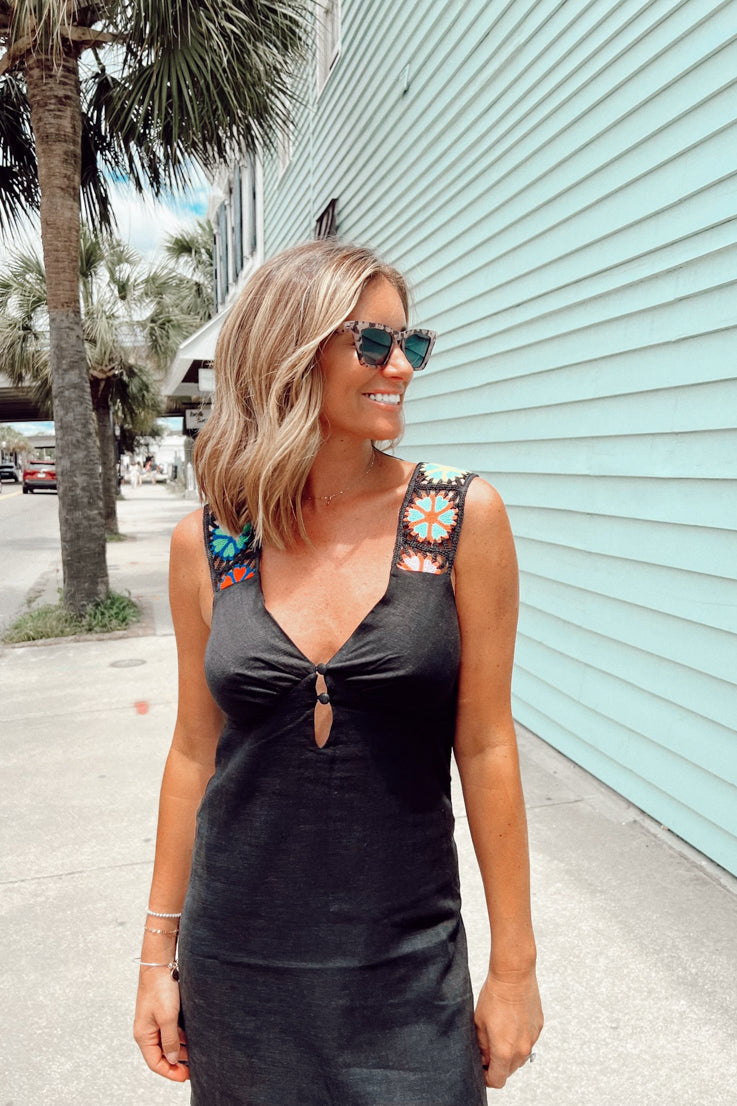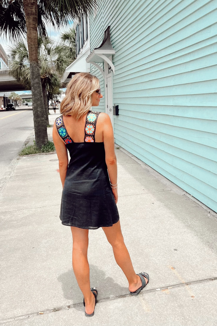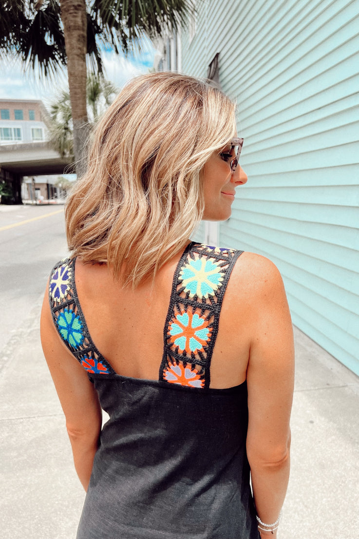 Un must have per il tuo guardaroba estivo: adoriamo questo miniabito nero all'uncinetto. Presenta una profonda scollatura con dettagli colorati all'uncinetto sulle spalline. Perfetto per un concerto o un festival estivo.