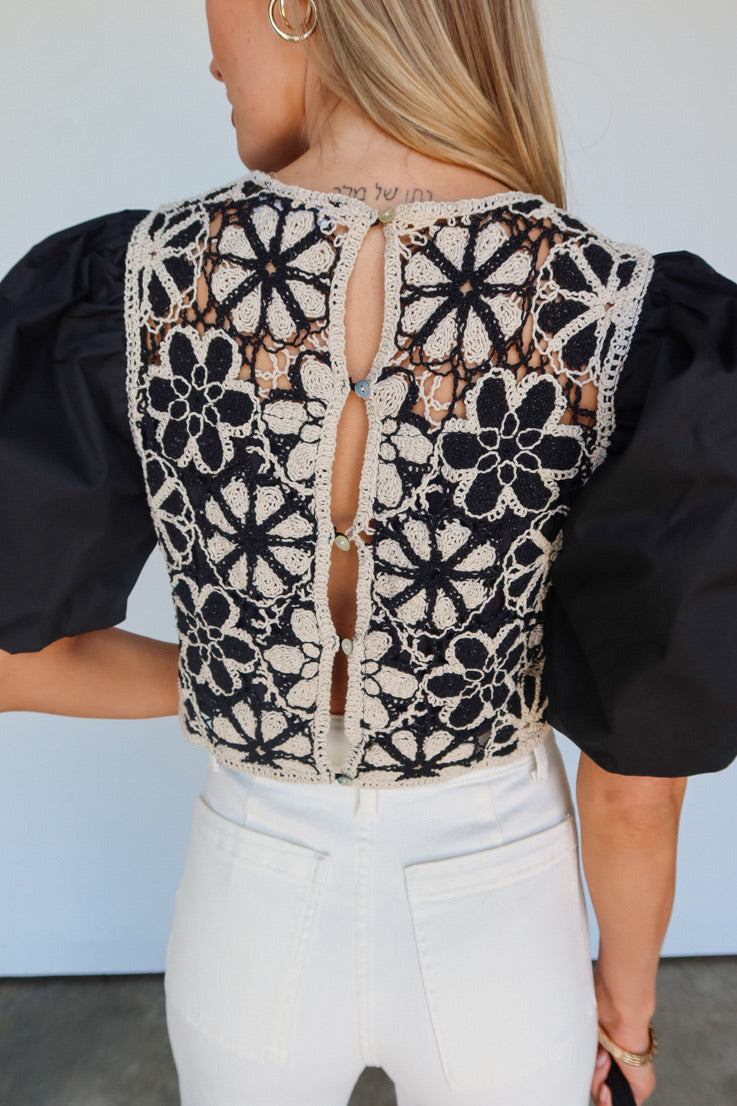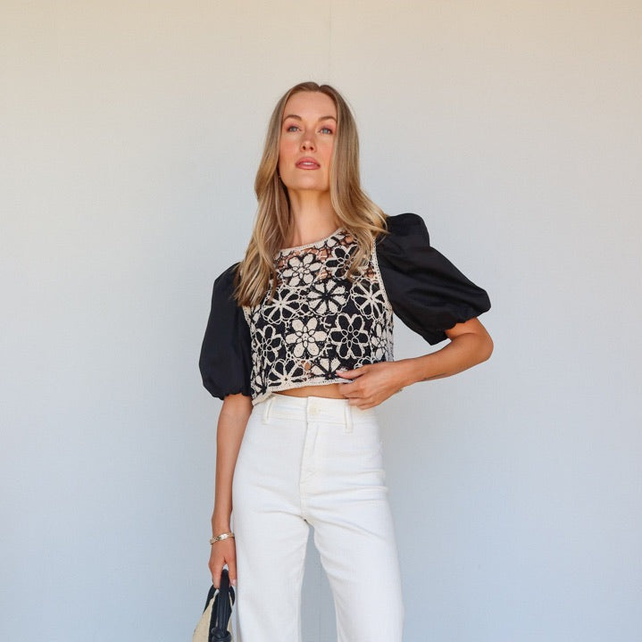 Il nostro top preferito in assoluto è appena arrivato sul sito: questo nuovo top Poppy è un sogno che diventa realtà. Il tessuto esterno è una stampa floreale all'uncinetto e il top presenta una fodera nera a fascia sottostante. Le maniche sono corte a sbuffo nere che creano un contrasto perfetto con il corpo. Abbinalo a un denim nero o ai tuoi soliti jeans blu per un look raffinato e adorabile.