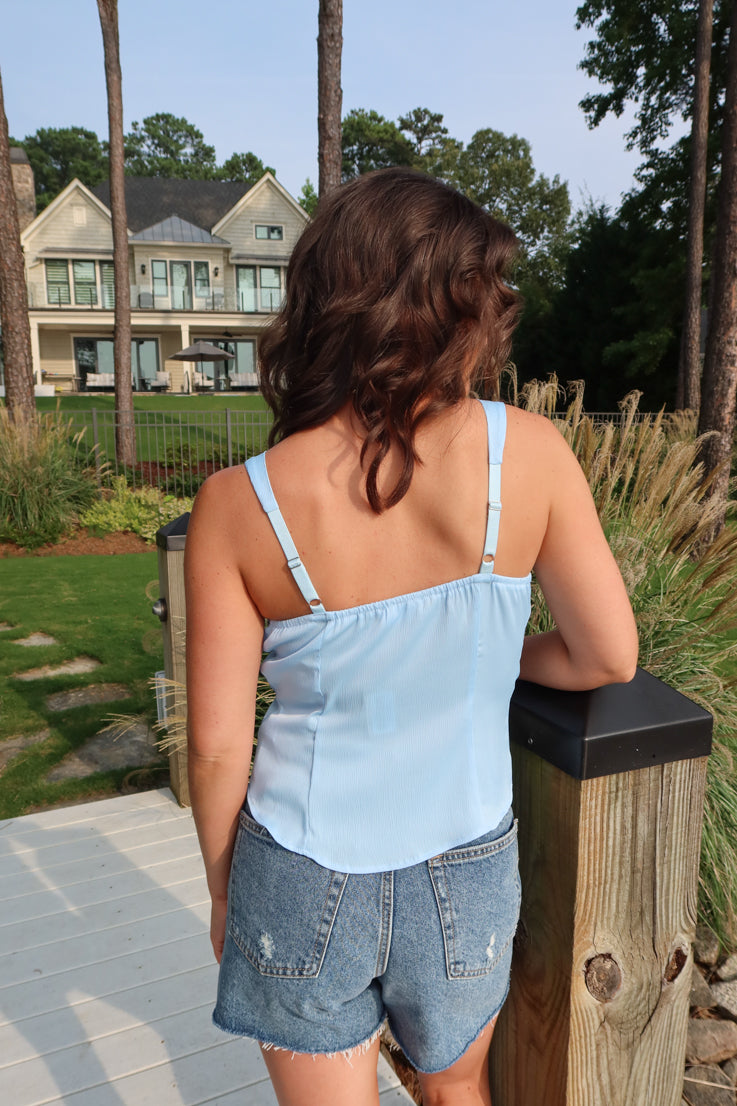 La nostra canotta Cool Girlie è il capo essenziale perfetto per l'estate. Questa canotta a coste azzurra offre una profonda scollatura a V, cinturini lungo il seno e lacci sul davanti. Con questo capo semplice e disinvolto, non passerai inosservata. Si abbina perfettamente a shorts di jeans corti e alle tue sneakers preferite.