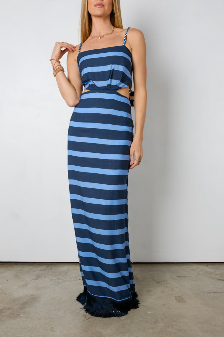 Il nostro abito lungo Window Seat è un modello unico con un tocco speciale. Questo prendisole a righe presenta strisce azzurre e blu navy, spalline intrecciate, aperture laterali e un fiocco sulla schiena che garantiscono una vestibilità perfetta. E per completare il look, è rifinito con una frangia sull'orlo inferiore. Un capo indispensabile per ogni guardaroba da vacanza!