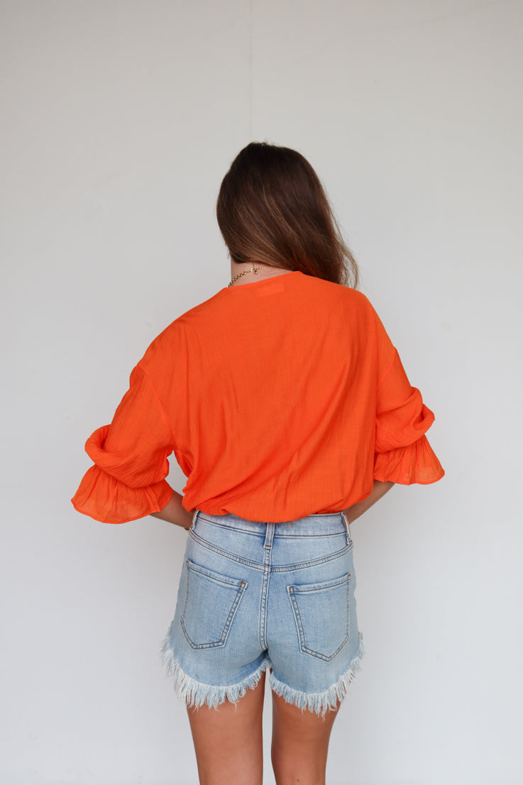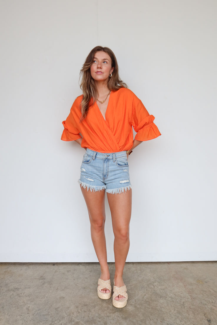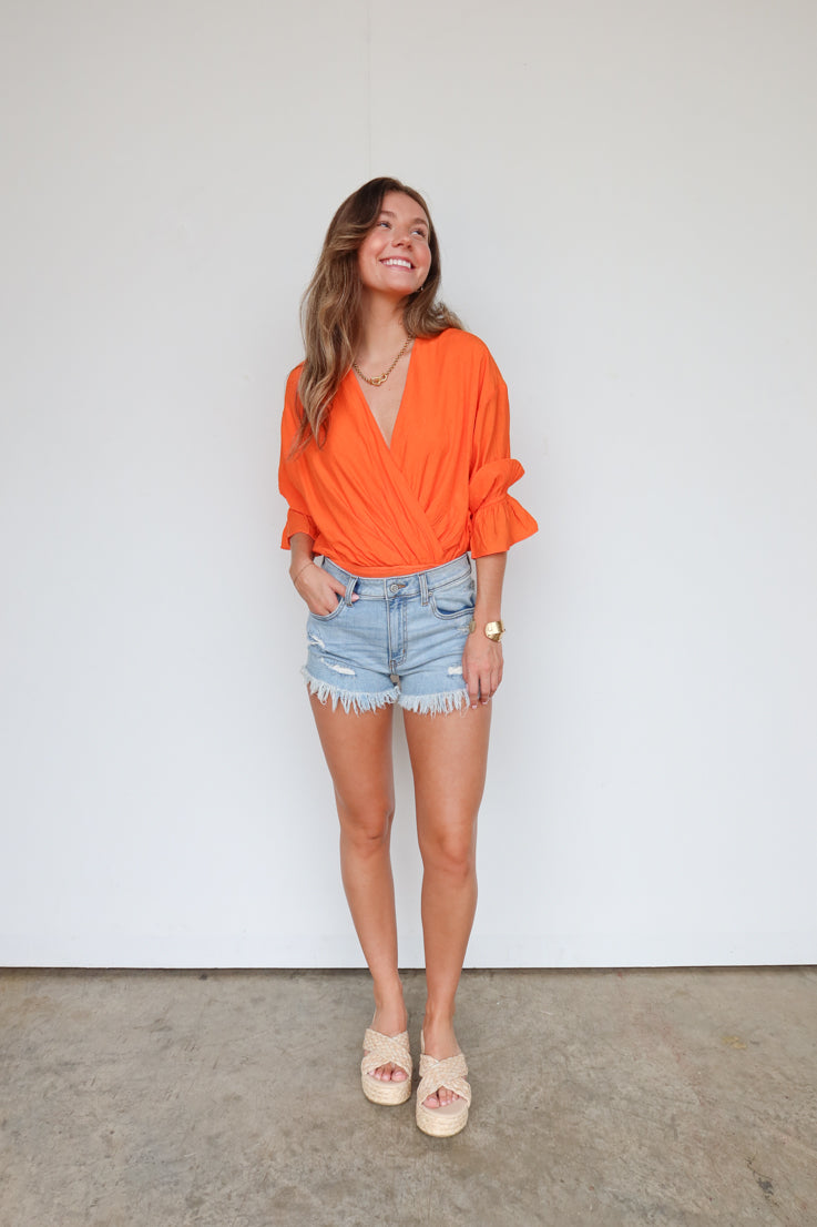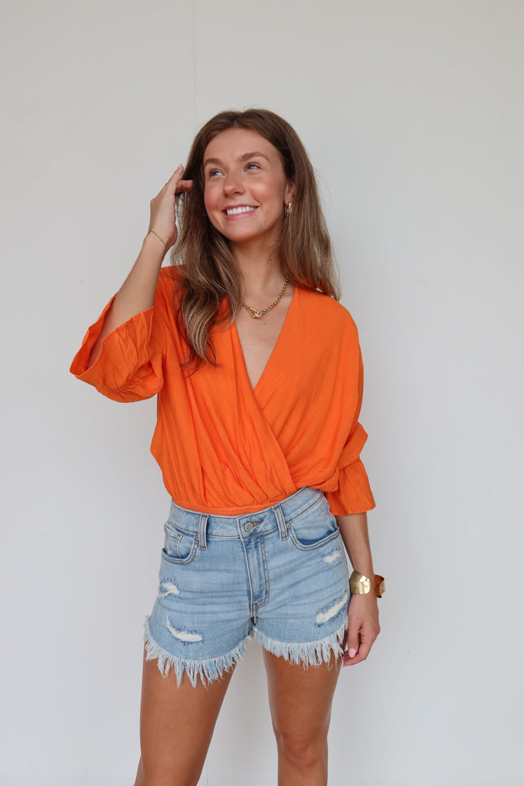 Con questo body arancione chic ed elegante sarai sicuramente sbalordita. Presenta una vestibilità ampia e fluida, con una parte anteriore incrociata e avvolgente e maniche lunghe a sbuffo con polsini aderenti. Indossalo con una minigonna e tacchi a spillo o con i tuoi pantaloncini di jeans preferiti per un look casual raffinato.