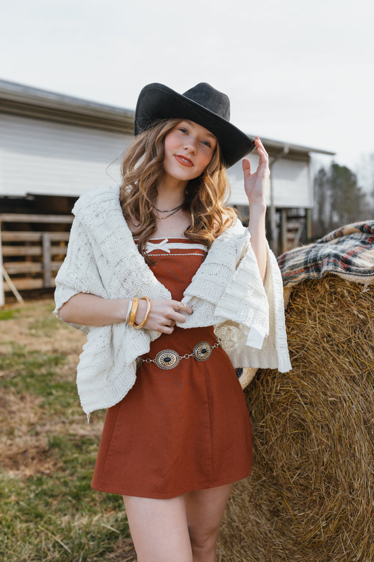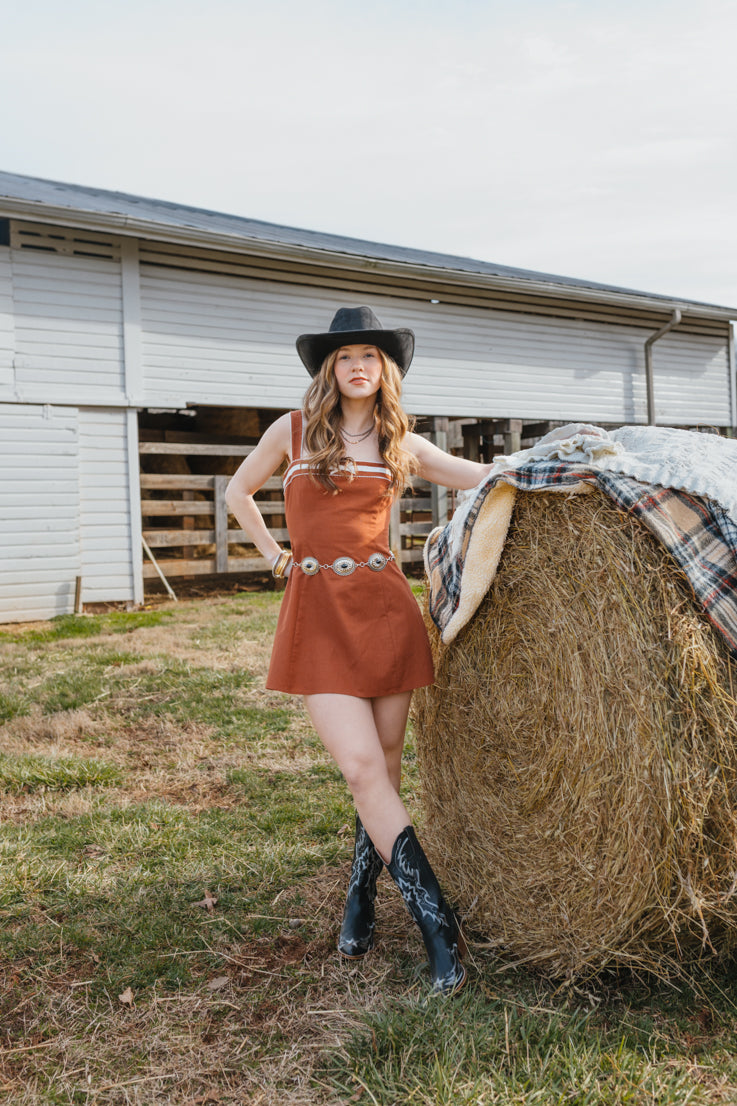 Sii impeccabile ed elegante, sfoggiando il tuo stile deciso con questo miniabito color cognac con scollatura quadrata e spalline spesse. Il dettaglio a righe bianche lo rende classico, ma il suo tocco audace lo rende contemporaneo. Vestirsi in modo energico non è mai stato così di moda!