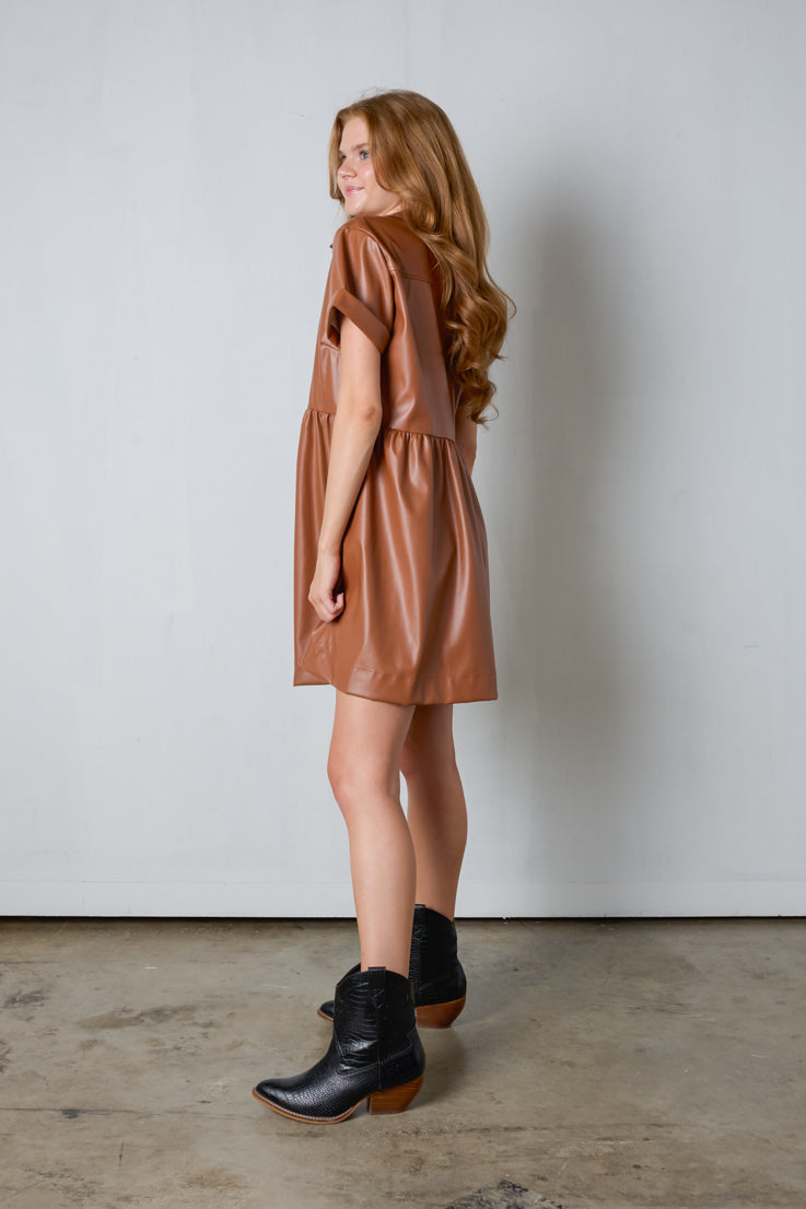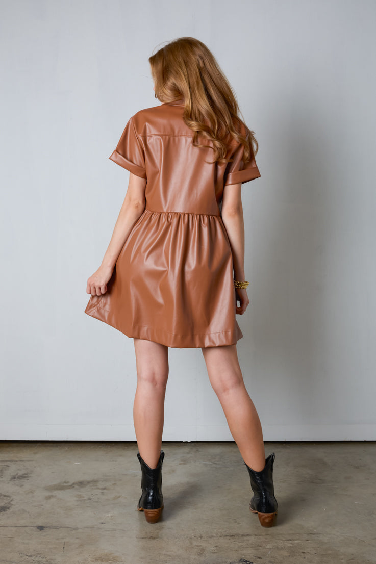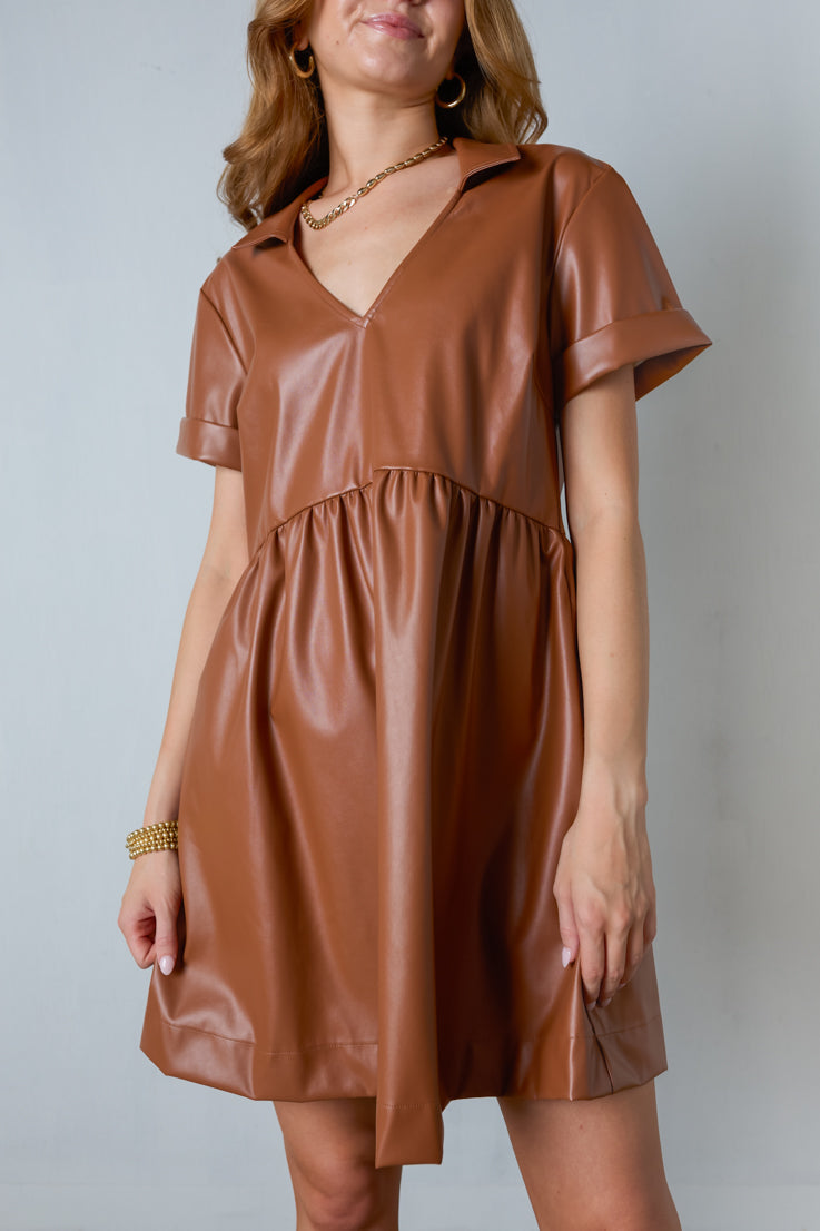 Sentiti audace e audace con l'abito Crash Into Me! Realizzato in pelle vegana color cammello e caratterizzato da scollo a V con colletto, maniche corte con polsini arrotolati e ampie tasche nascoste, osa e rendi indimenticabile il tuo look. Questo abito è un must have per la stagione!