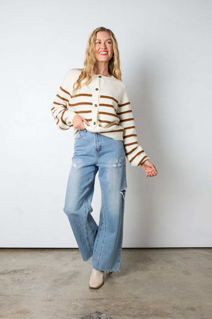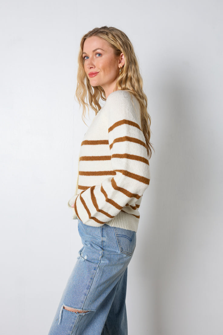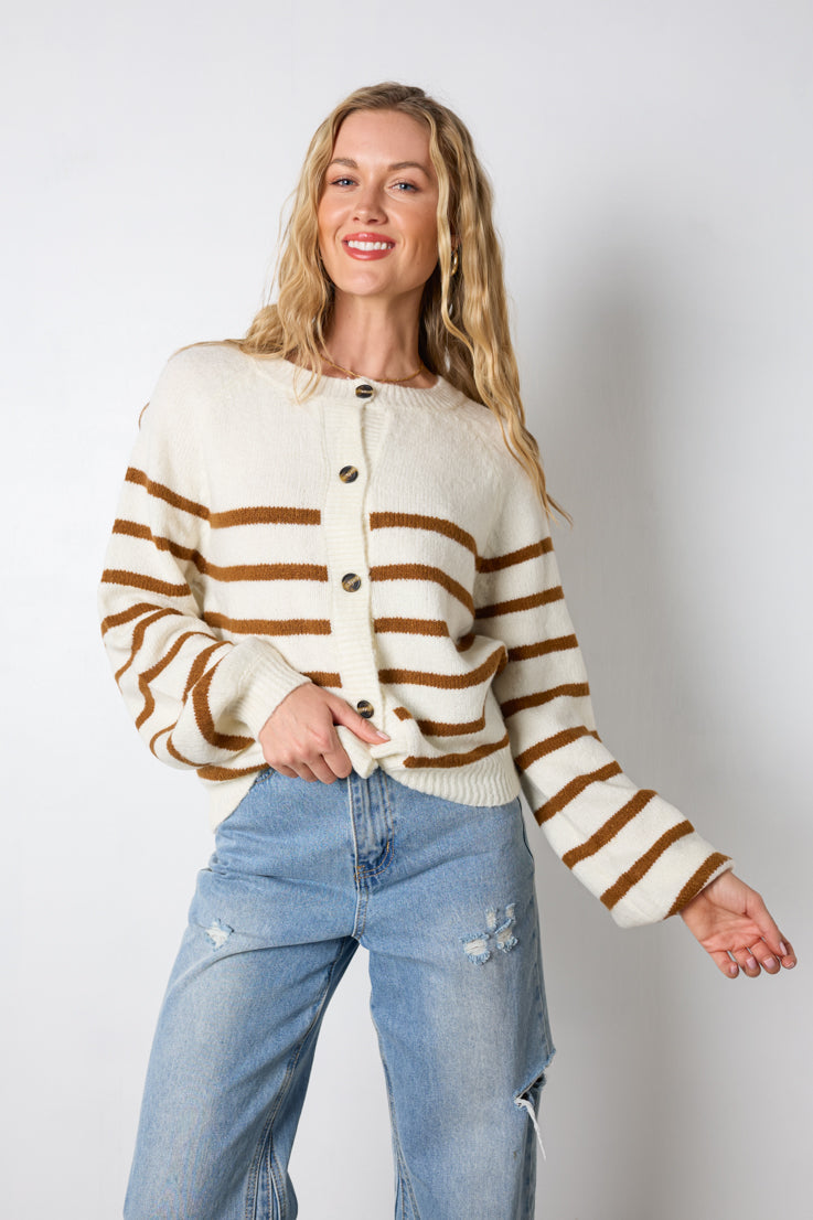 Il cardigan Morning Brew è il capo perfetto per un look cool e disinvolto! Questo cardigan a righe color crema e marrone è dotato di abbottonatura frontale e ampie maniche lunghe, e la sua vestibilità oversize ti farà sentire comoda ed elegante per tutto il giorno. Indossa questo comodo cardigan e rendi le tue mattine ancora più belle.