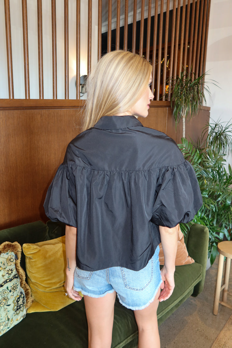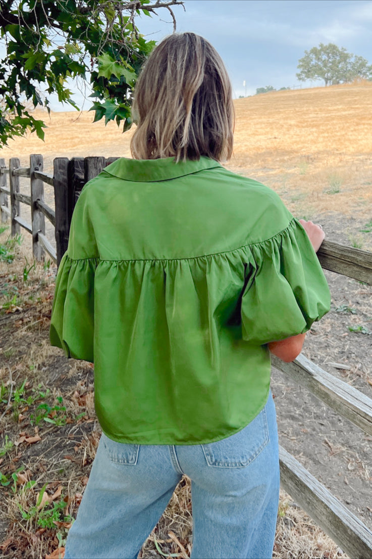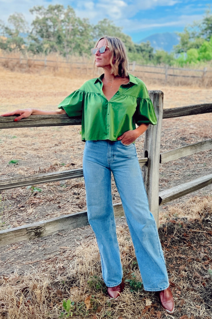 Ecco il Martha Top, la camicia a maniche corte con bottoni perfetta per la transizione dall'estate all'autunno! Con maniche a palloncino, bottoni rivestiti in tessuto e una silhouette facile da indossare, questo top porterà il tuo guardaroba a un livello superiore! Scegli tra un elegante nero o un vivace verde avocado: lo indosserai con tutto.