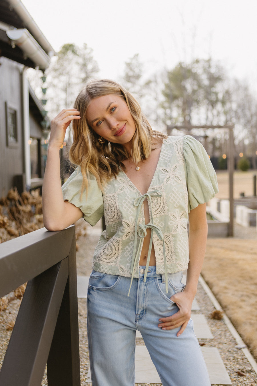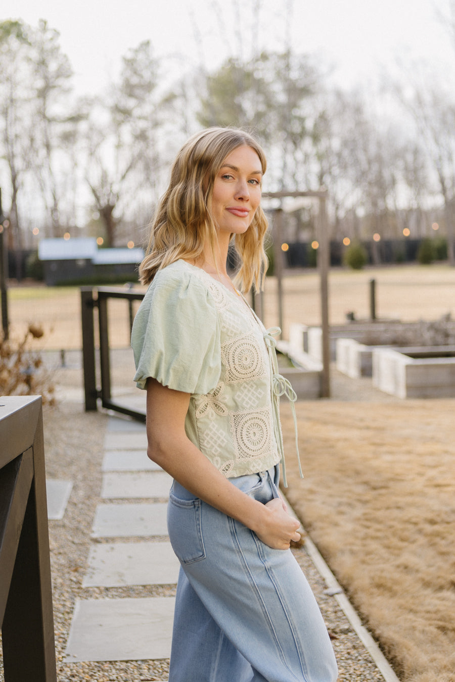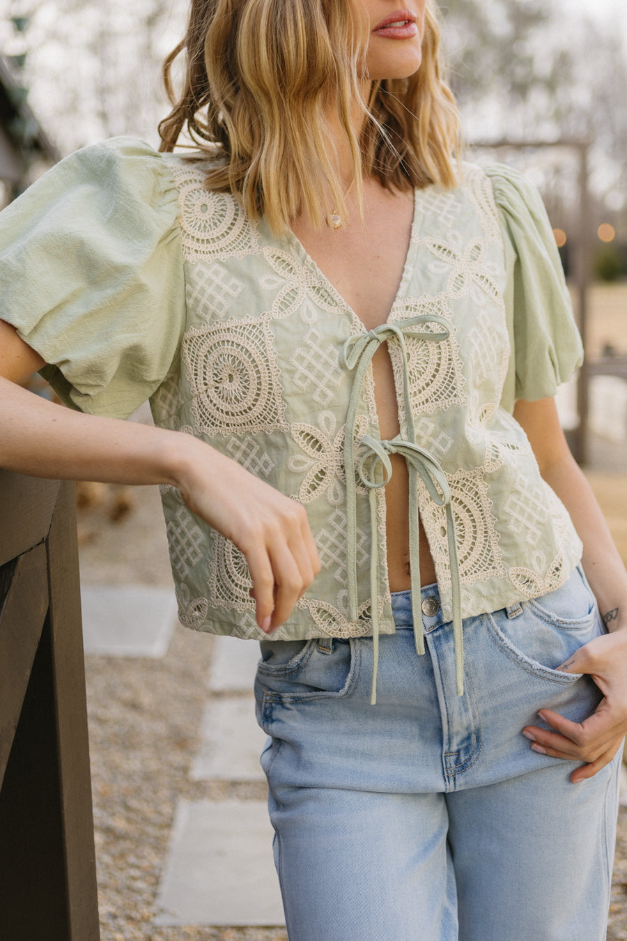 • Top color salvia con patchwork ricamato color crema