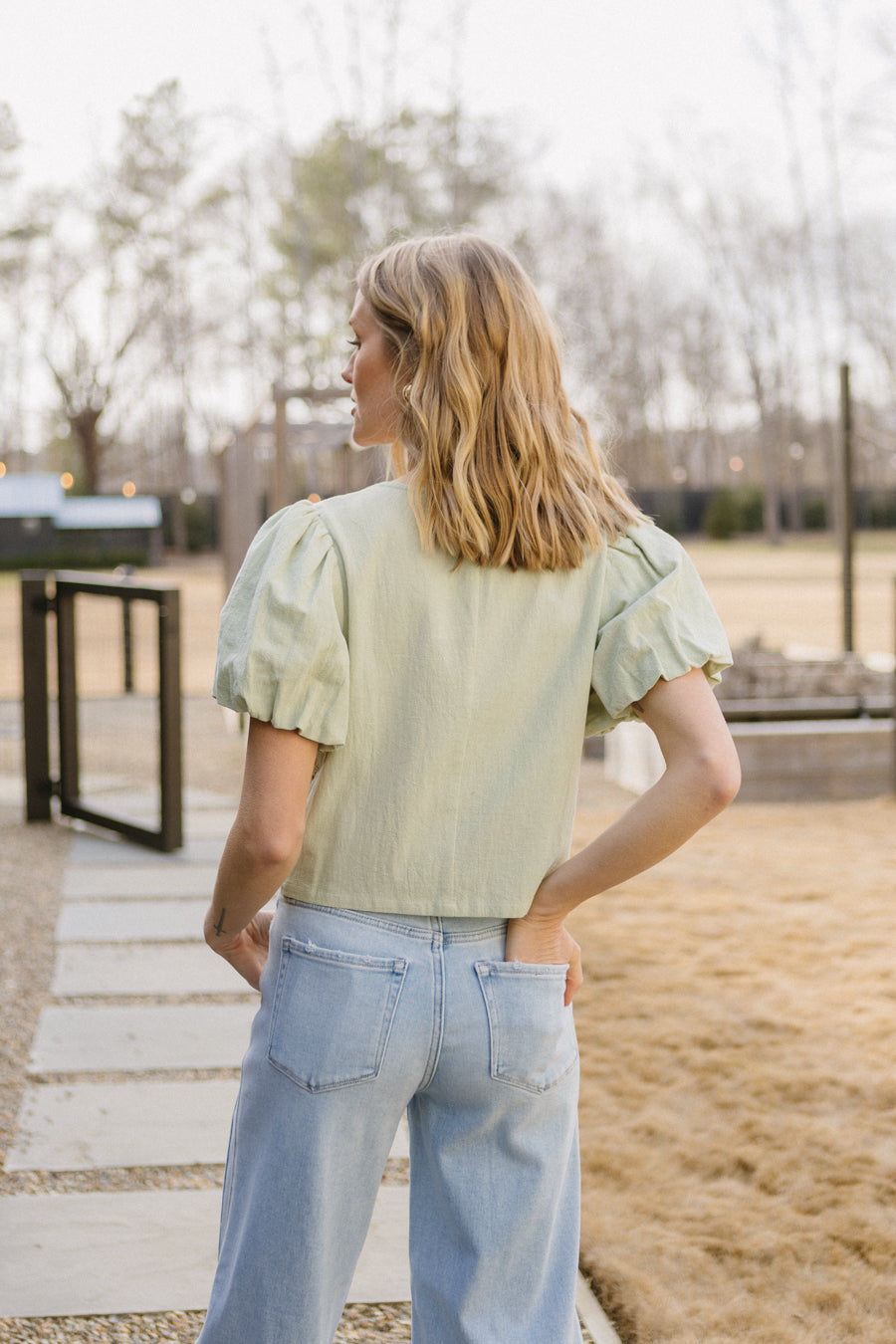• Maniche corte a sbuffo con polsini elastici