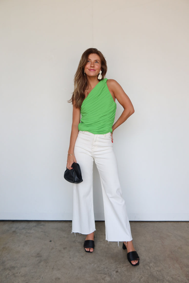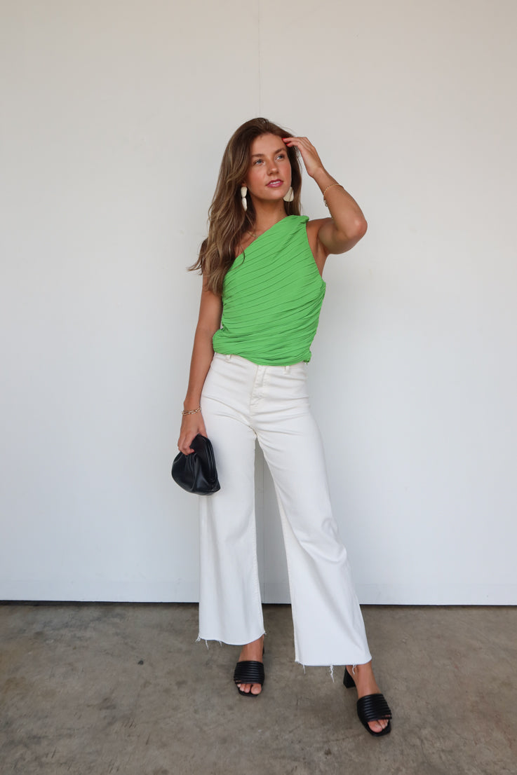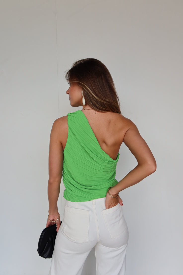 Metti in mostra le spalle con questo top "When the Party's Over"! È perfetto per ogni occasione, che tu sia fuori per una serata in città o che tu voglia semplicemente apparire chic a casa. Il colore verde kelly e le arricciature ti permettono di distinguerti in qualsiasi stanza. Preparati a riscaldare l'estate con questo top e un paio di shorts in denim! Adoriamo il design monospalla, così lusinghiero!