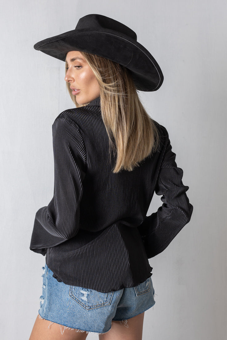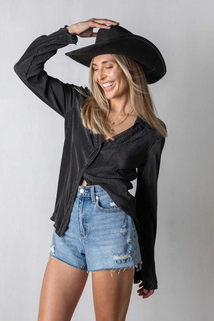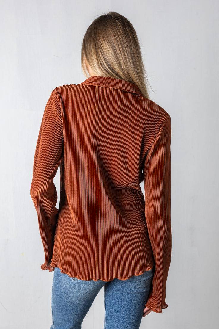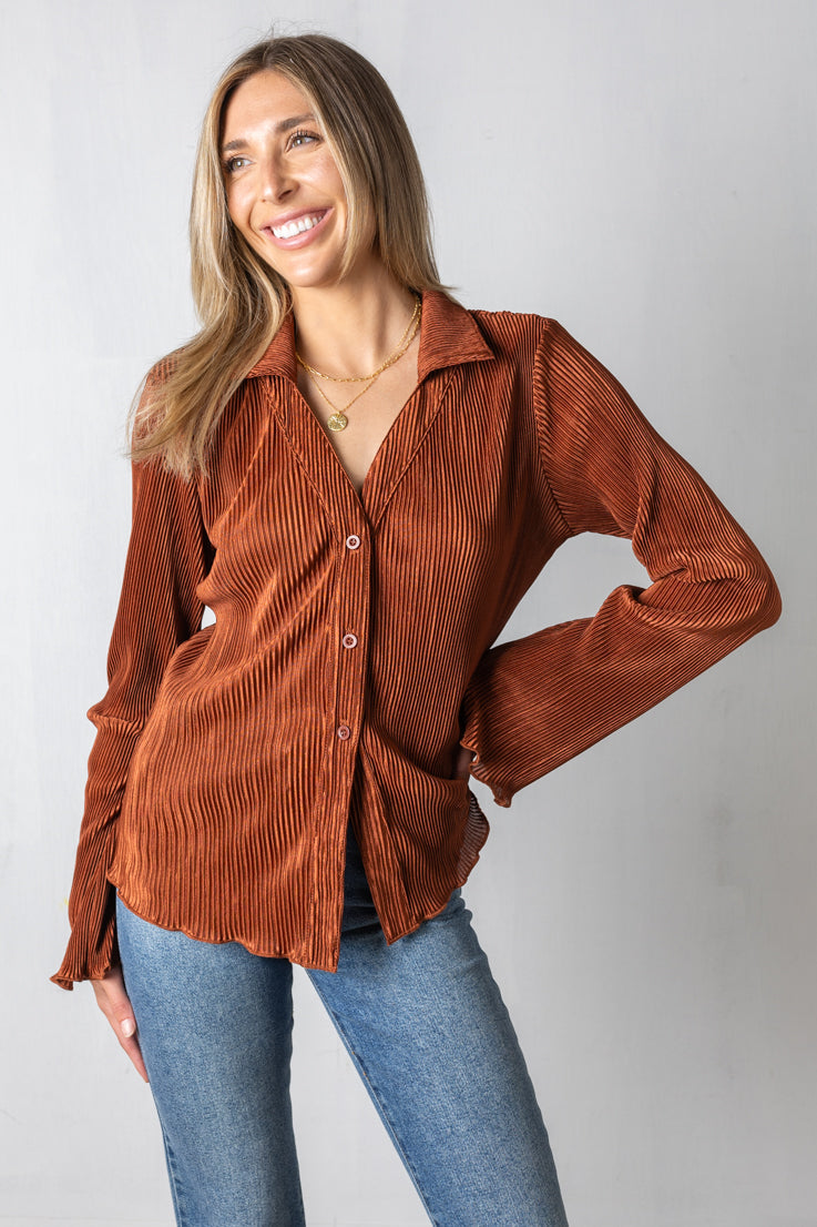Non lasciarti sfuggire questo must-have autunnale: il top Don't Hesitate! Questa blusa a maniche lunghe con bottoni è realizzata in un trendy tessuto plissettato a coste e presenta un orlo a balze. Scegli tra ruggine o nero e sfoggia un look autunnale con stile e stile.