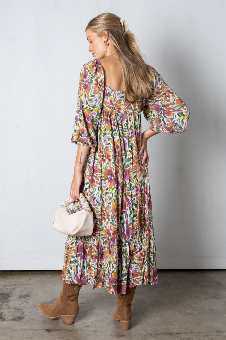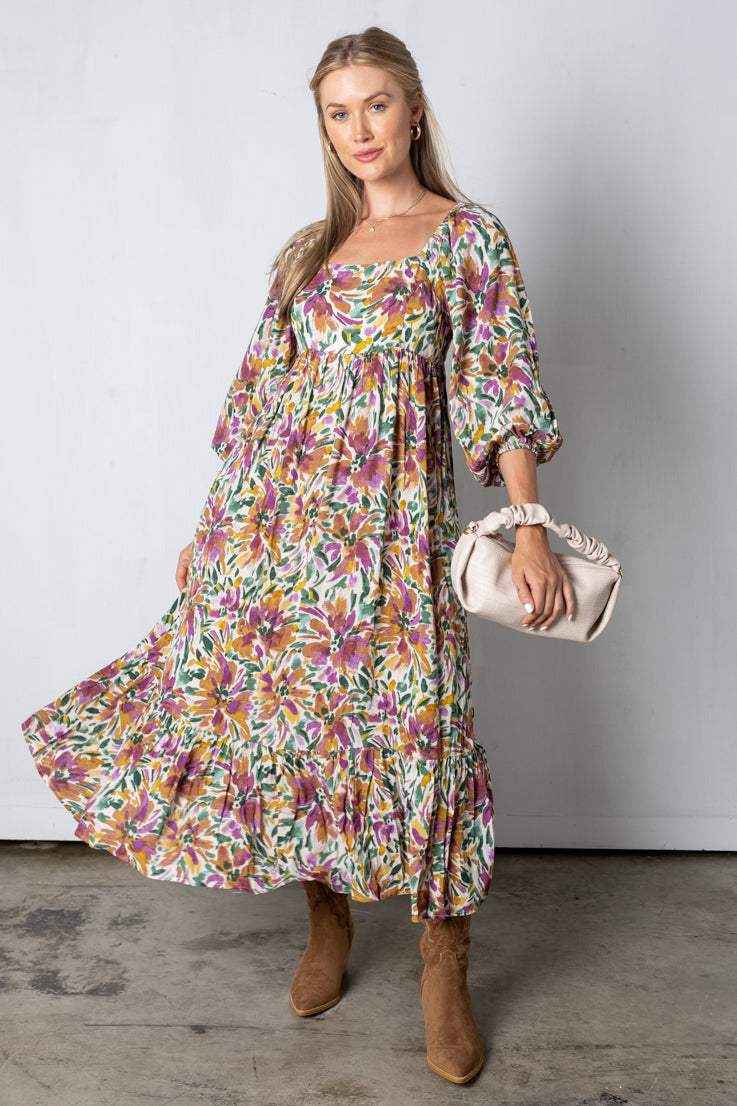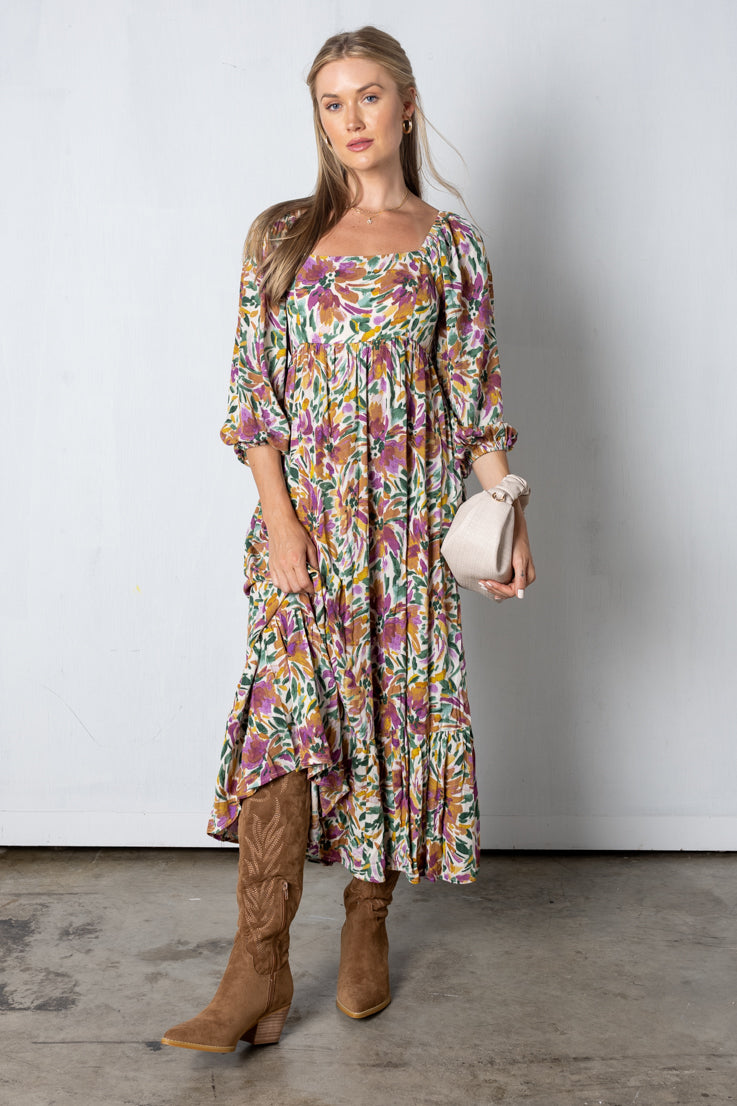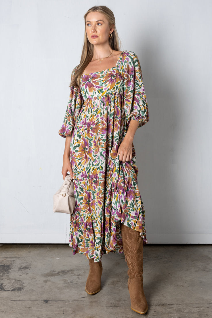 Sii elegante e cool questo autunno con il nostro abito Spill the Tea! Leggero e fluido, questo abito lungo presenta una splendida stampa floreale viola, verde e marrone dorato, uno scollo quadrato e maniche a tre quarti. Un capo indispensabile per ogni guardaroba! Cosa aspetti?