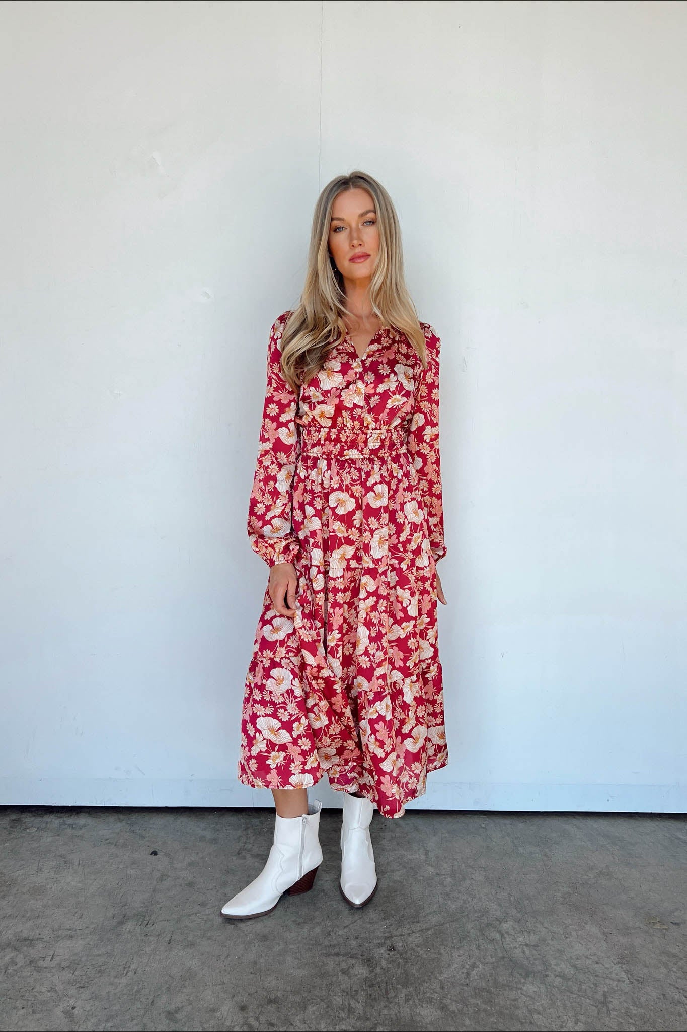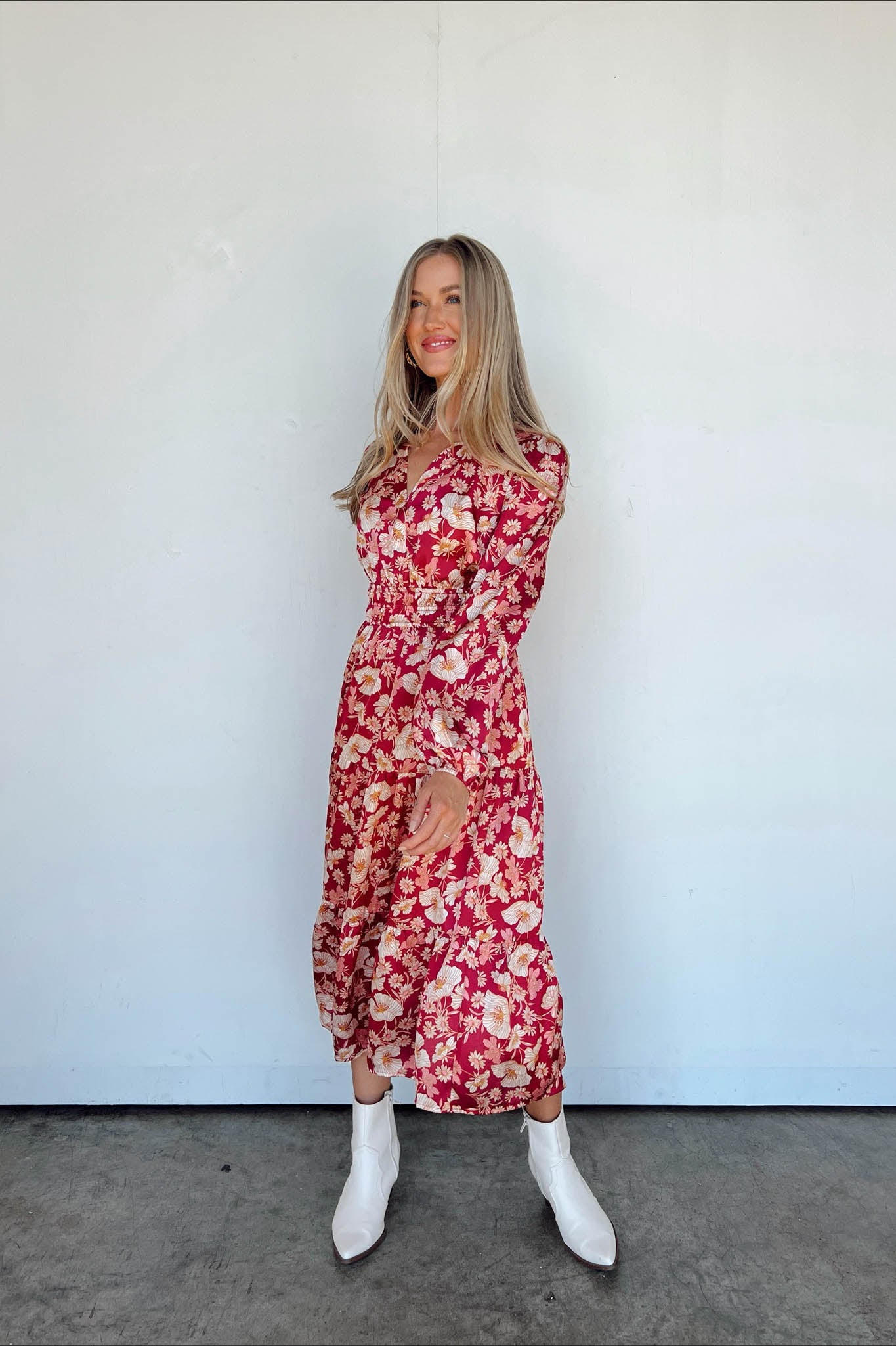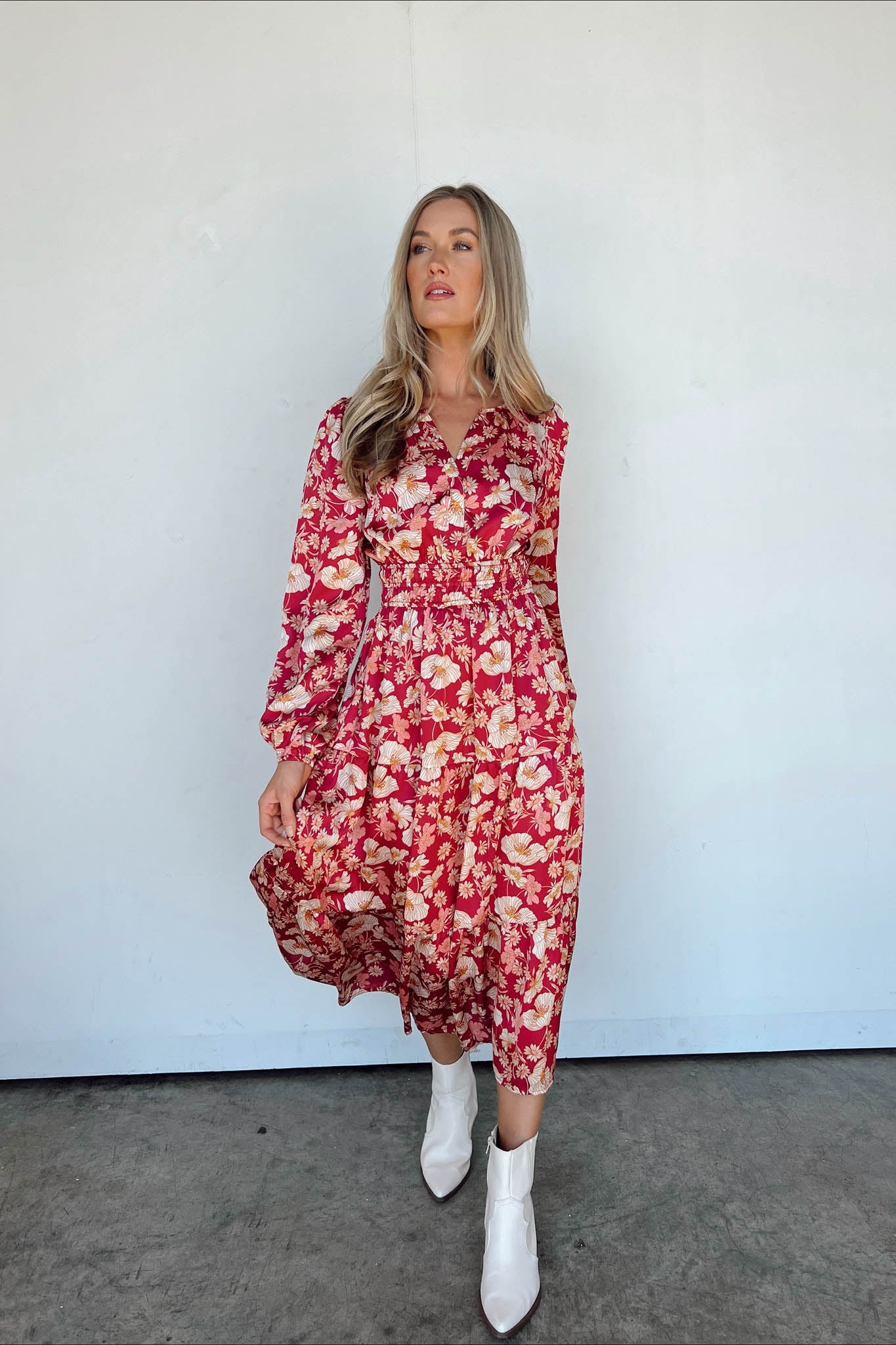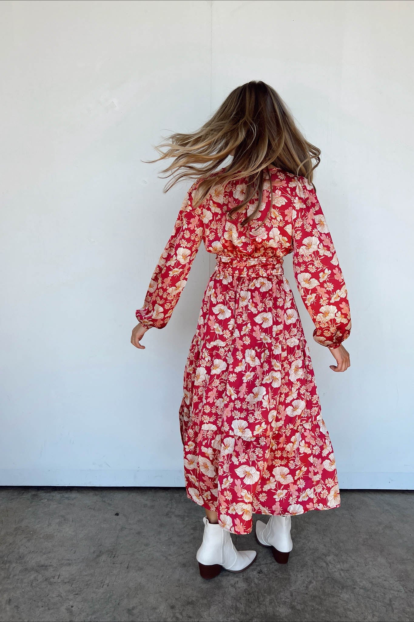 Stiamo vivendo un momento di gloria indossando questo splendido nuovo maxi! Lo sfondo della stampa è bordeaux e la stampa floreale è color crema e oro, creando una combinazione di colori mozzafiato. L'abito è stretto appena sotto il seno e la gonna a balze arriva fino alla caviglia.