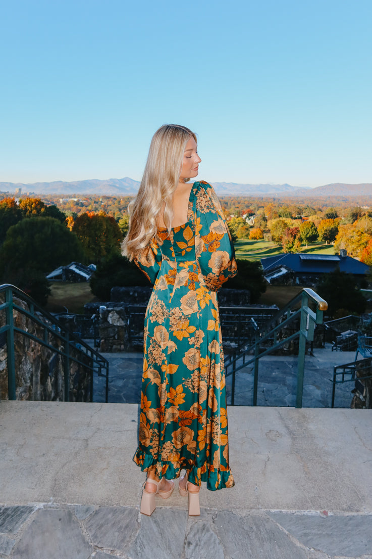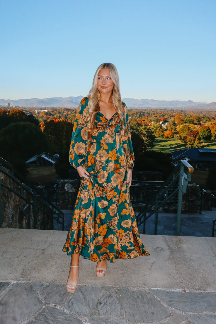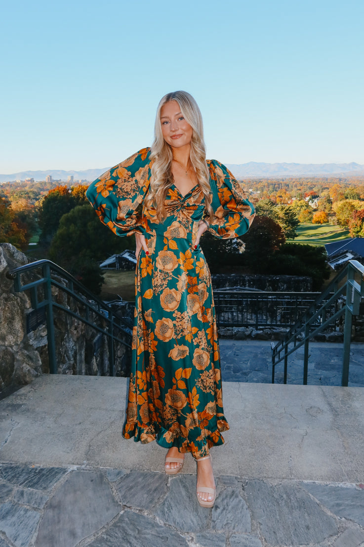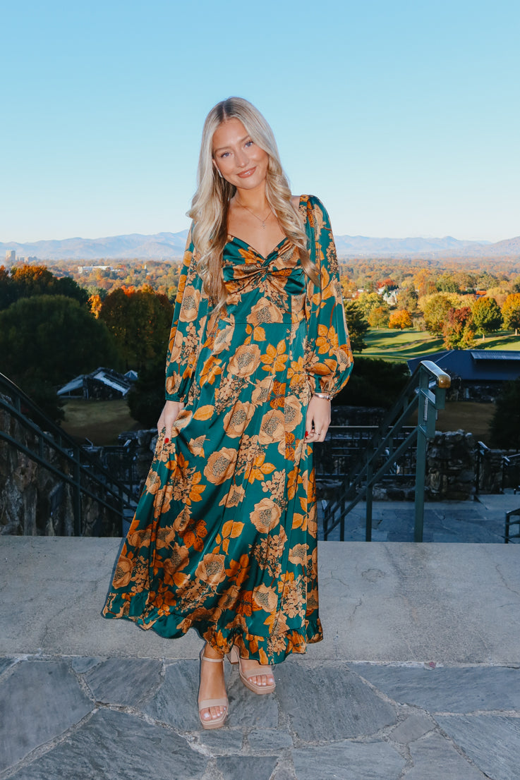 Fai colpo con questo intramontabile abito lungo Empress! Caratterizzato da un elegante sfondo verde smeraldo con vivaci fiori marroni e dorati, questo splendido abito aggiungerà un tocco di lusso a qualsiasi evento speciale. Realizzato in un tessuto morbidissimo, adorerai il dettaglio lusinghiero del volant sull'orlo inferiore e il nodo sul seno. Perfetto per una festa in occasione delle festività o come invitata a un matrimonio autunnale!