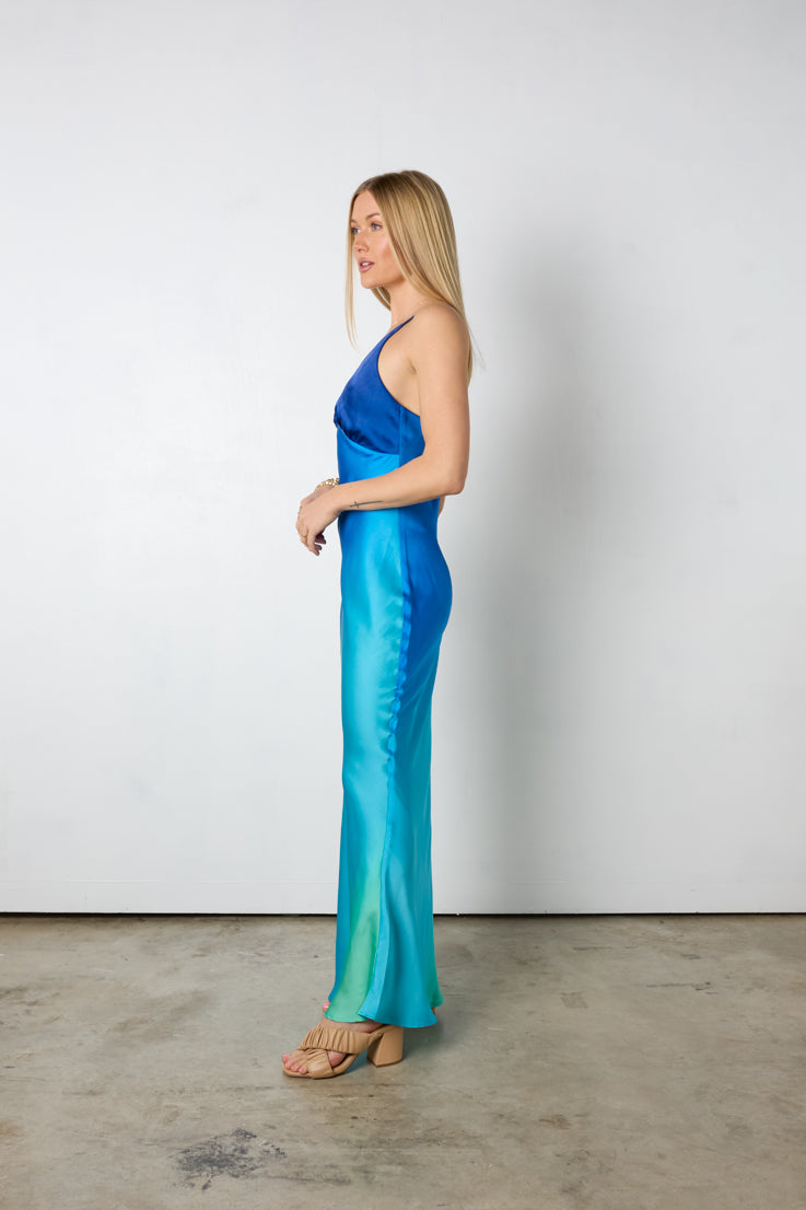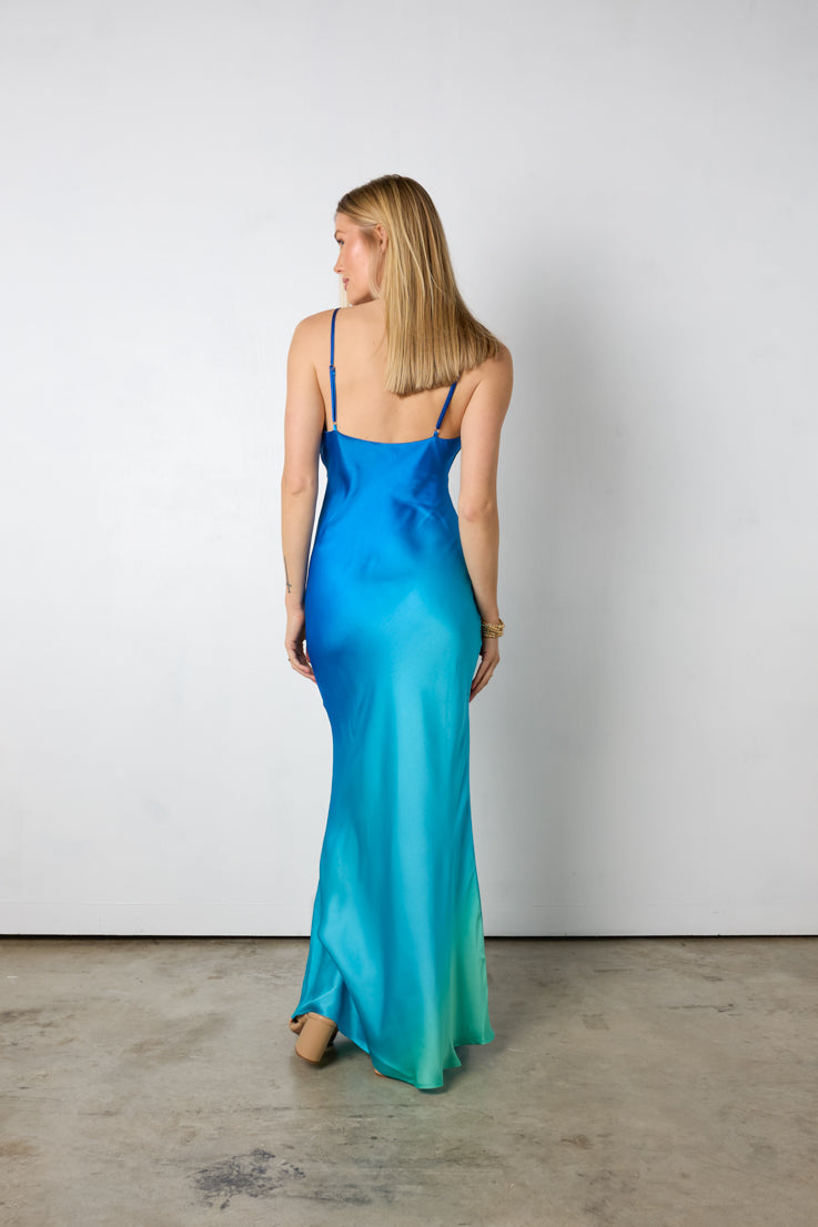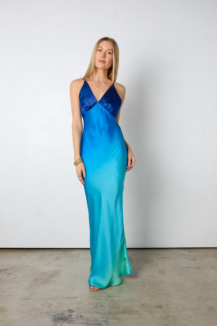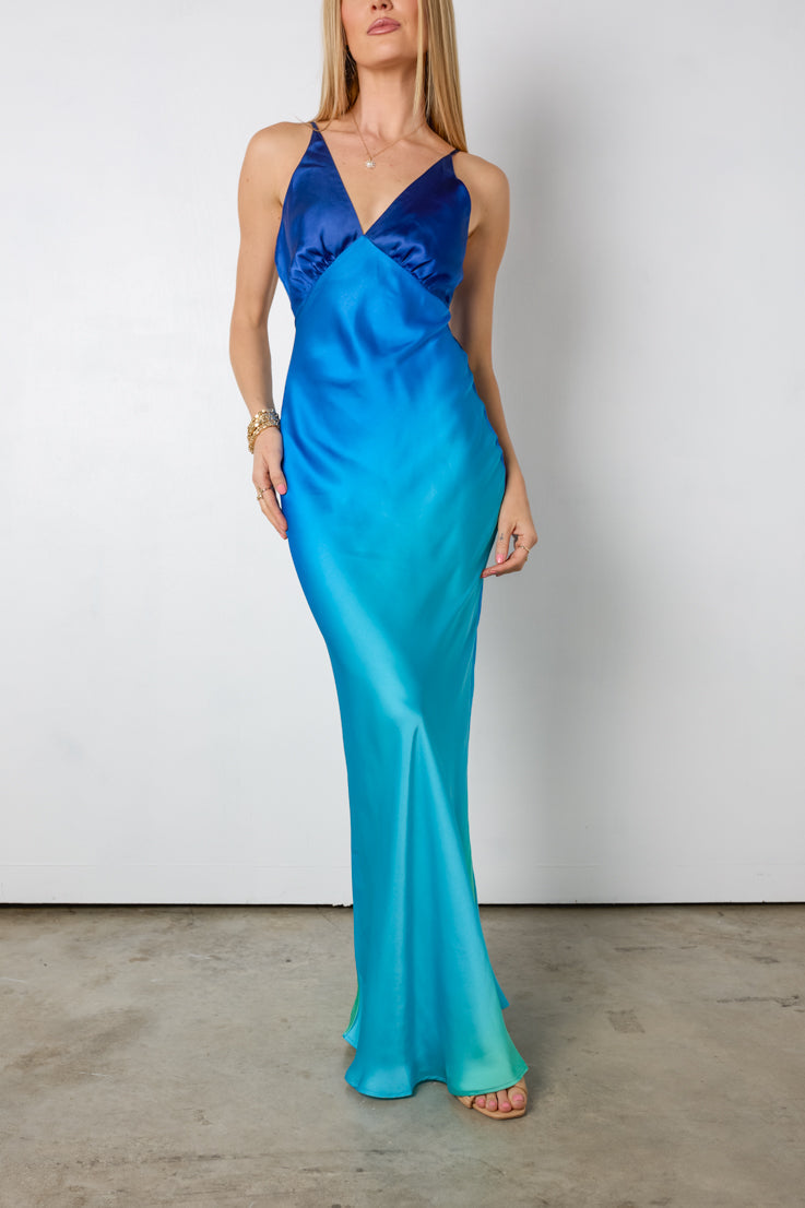 Immergiti in uno tsunami di stile con il Tidal Wave Maxi Dress! Questo incantevole abito presenta un top blu navy con una sorprendente cascata di sfumature blu e acquamarina sulla gonna. La lunghezza e la profonda scollatura a V ti faranno girare la testa per tutta la notte! Preparati a fare onde con questo splendido maxi dress in raso!