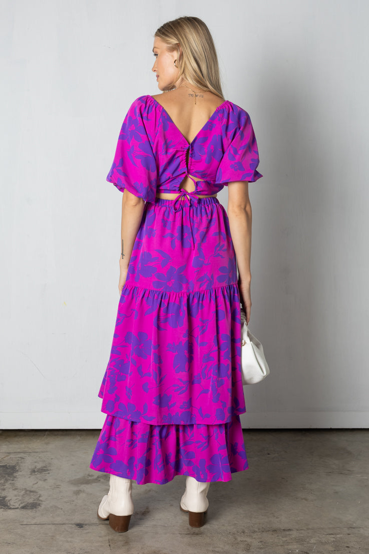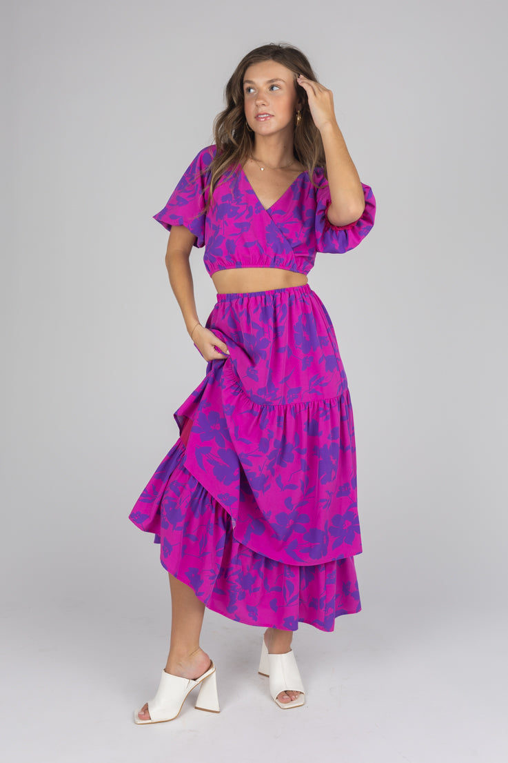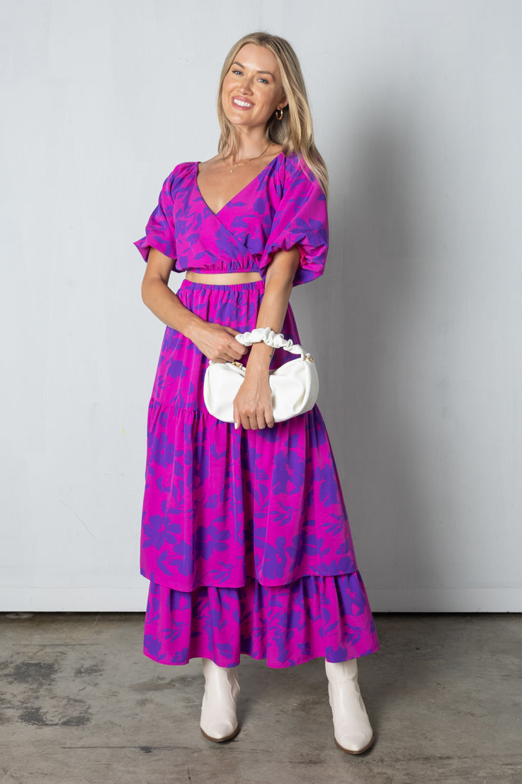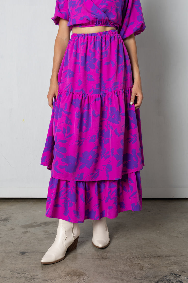 Mostra il tuo stile grintoso con questa gonna Santa Monica! Con un audace mix di motivi floreali rosa e viola, non passerà inosservata! Questa gonna lunga ha un corpo a balze con elastico in vita. Non passerà inosservata! Abbinala al crop top coordinato (venduto separatamente) o indossala con un body o un top a tinta unita.