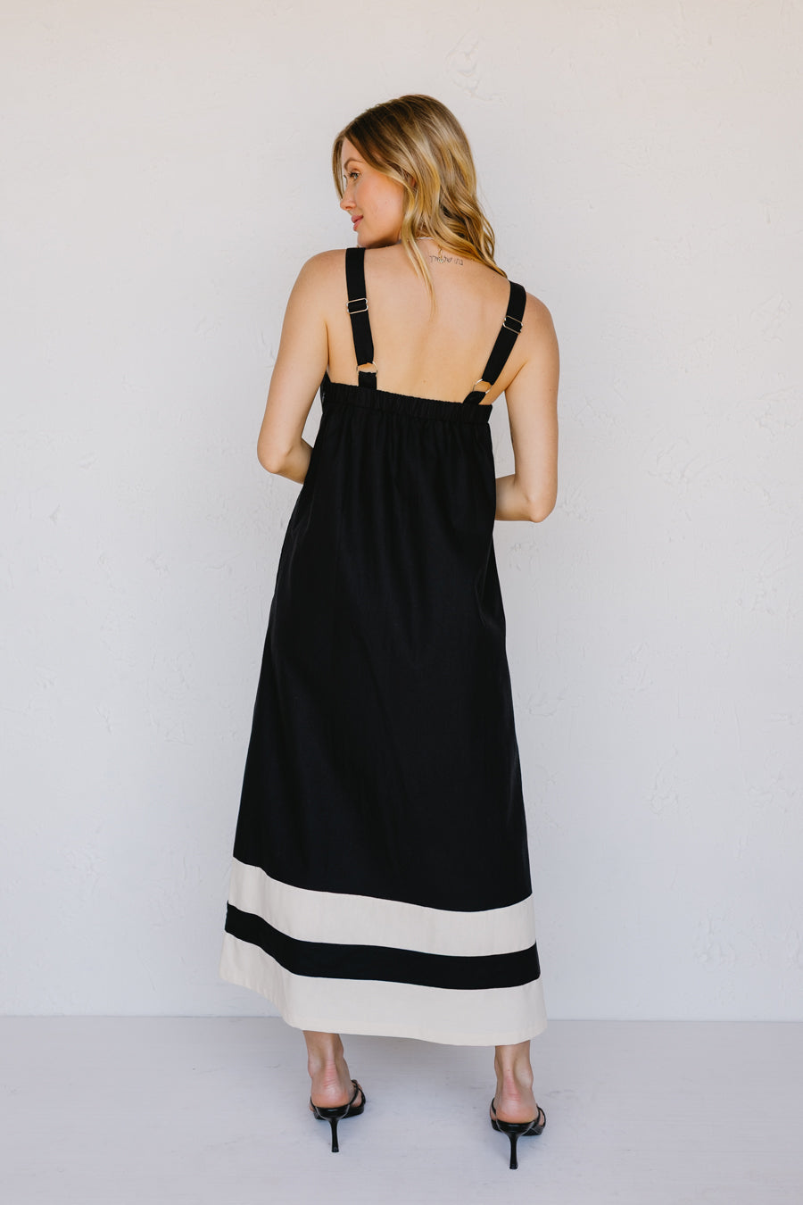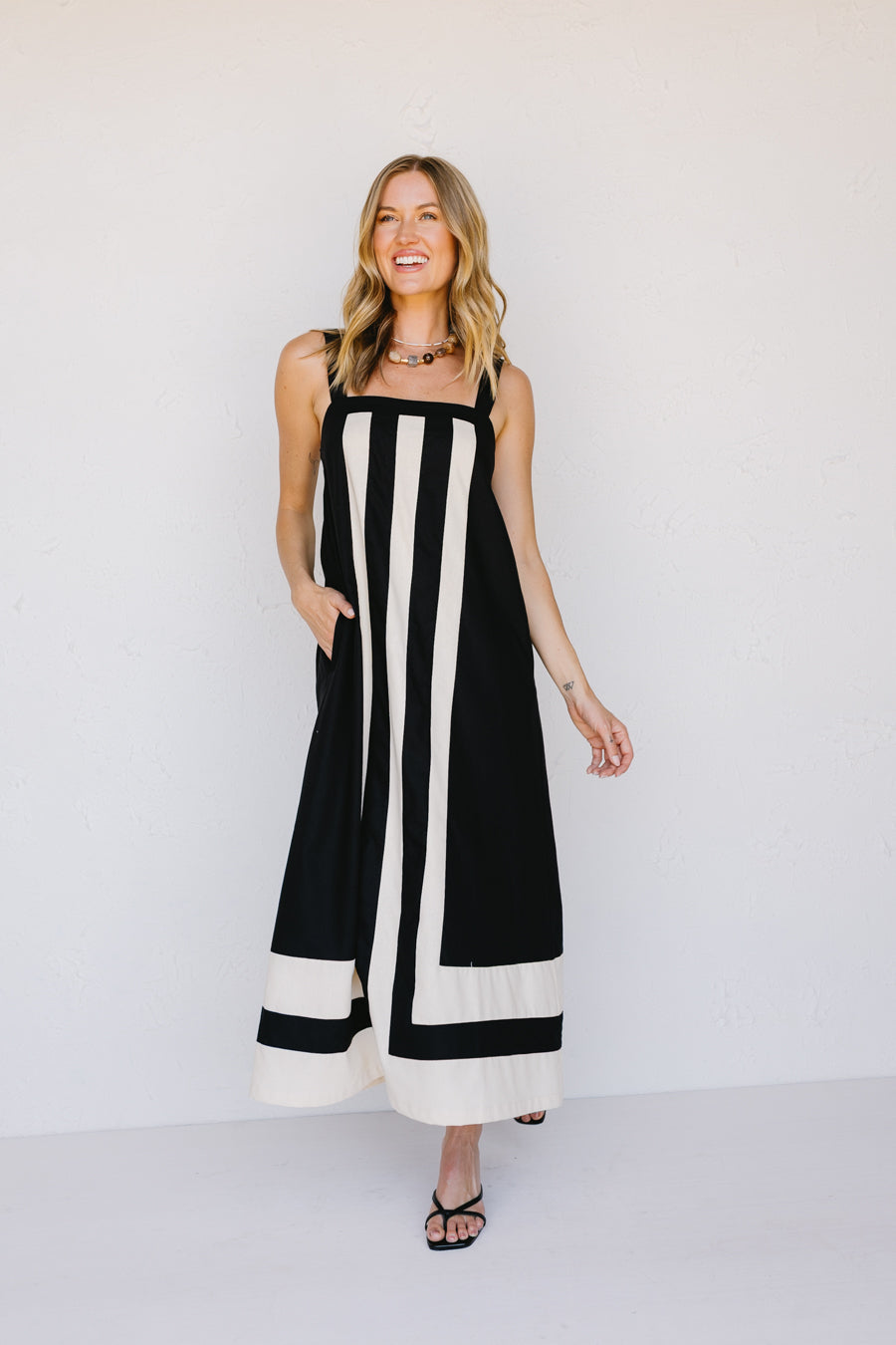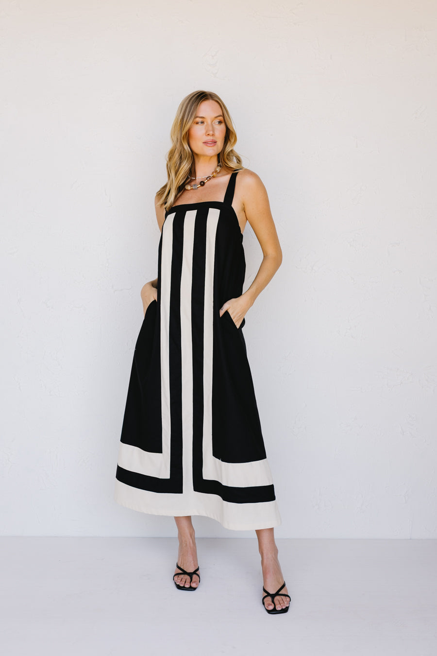 • Abito in misto lino nero e crema
