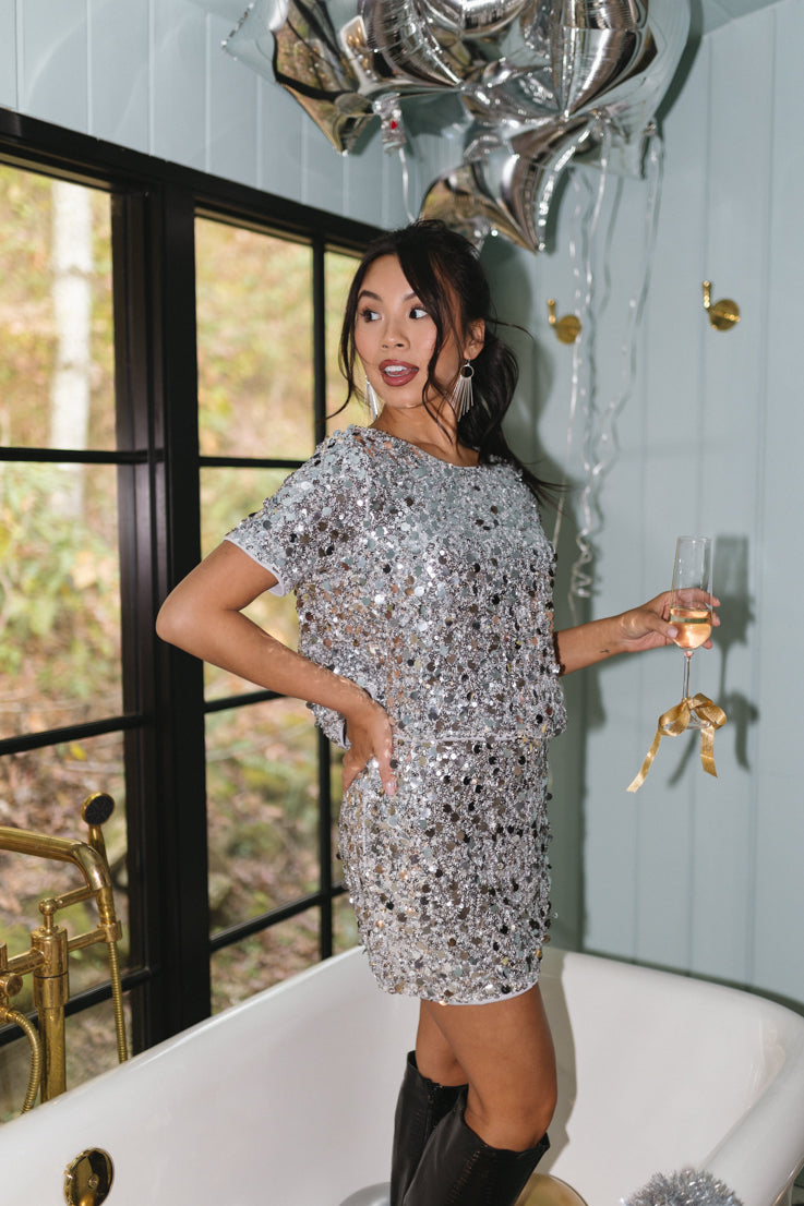 • Paillettes argentate di varie dimensioni che ricoprono il tessuto