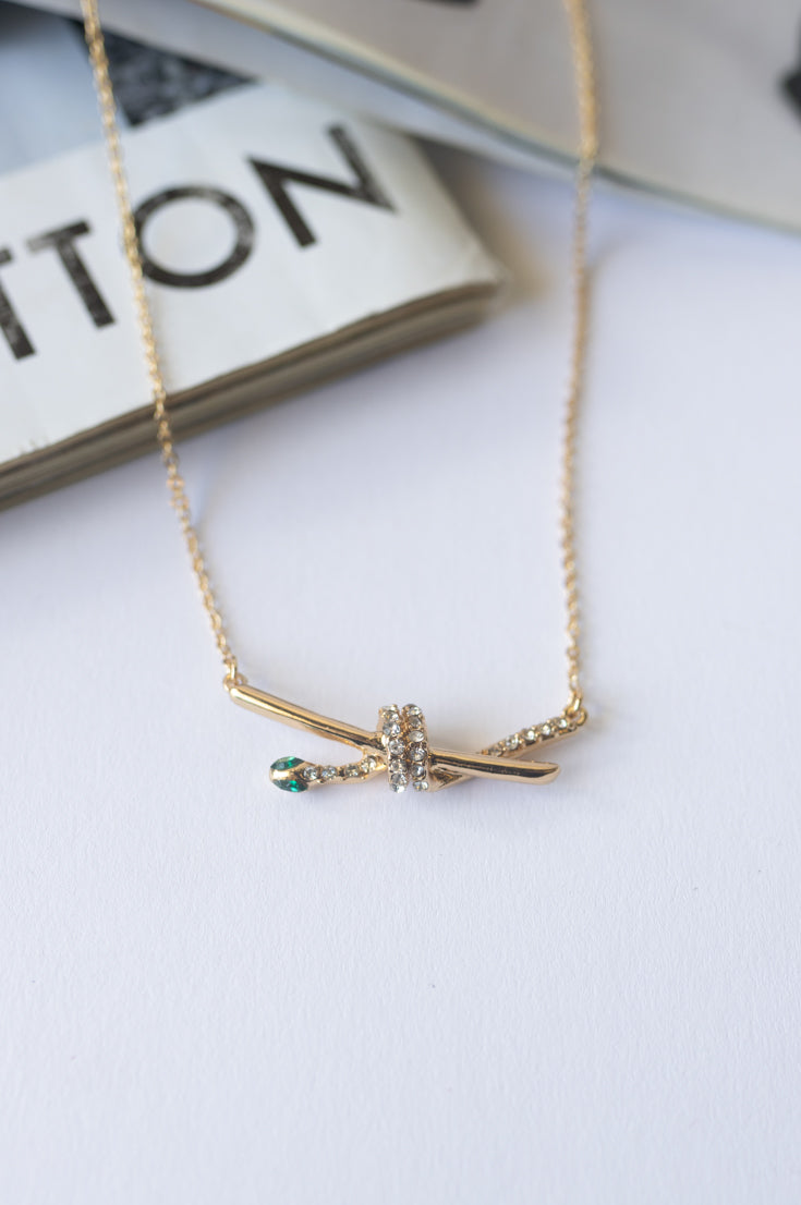 Fai colpo con questa scintillante collana placcata oro, caratterizzata da un elegante serpente avvolto con cura attorno a un ramo e delicatamente impreziosito da strass. Indossala con sicurezza: sarà la tua reputazione a salire in cima!