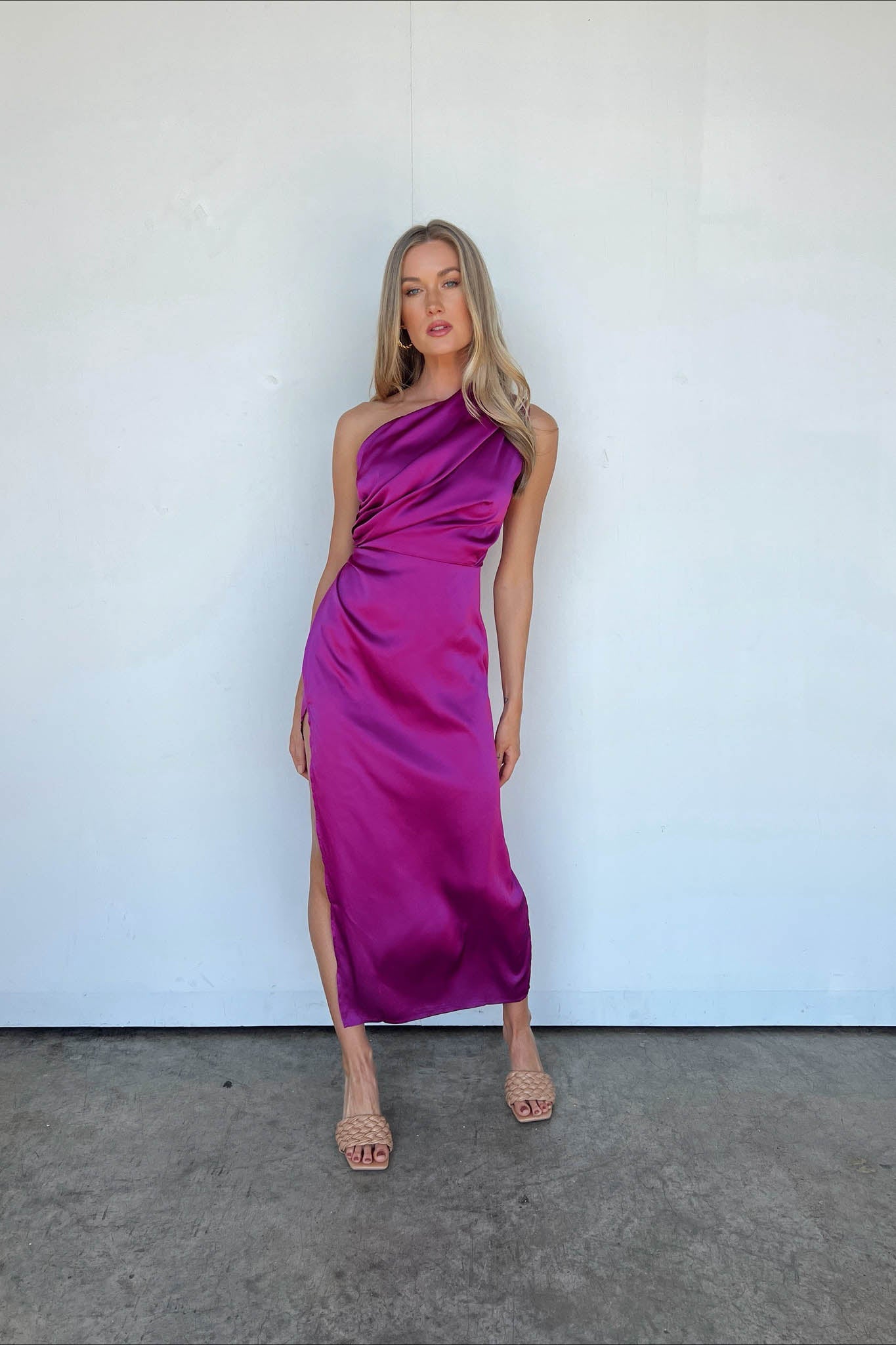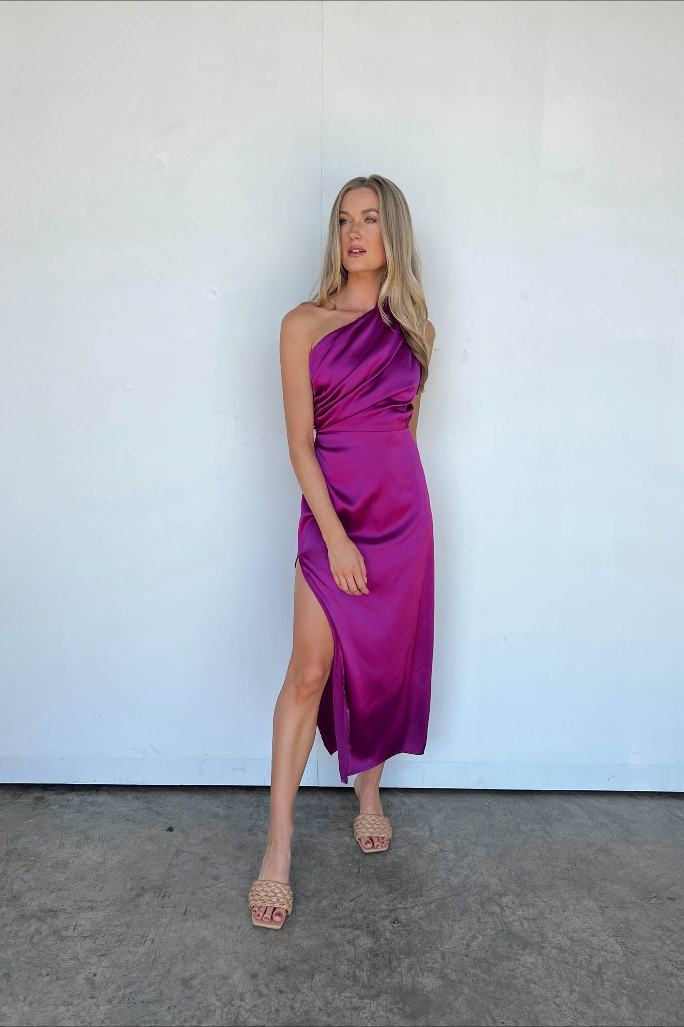 Questo splendido abito viola gioiello catturerà tutti gli sguardi quando ti vedranno. Adoriamo il dettaglio monospalla e lo spacco sul davanti, che lo rendono perfetto. Togli i tacchi alti e i gioielli e il tuo outfit è completo.