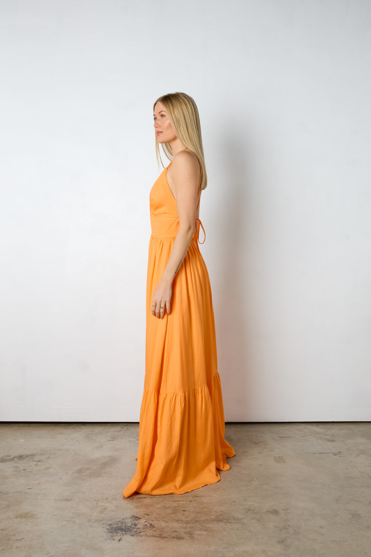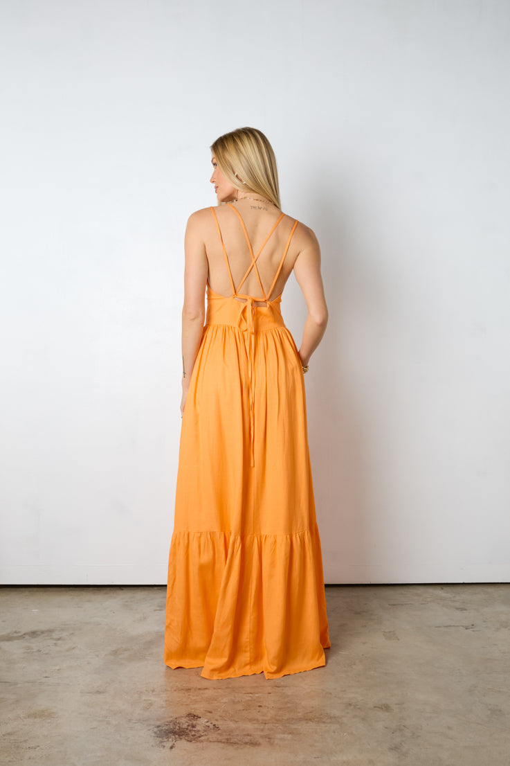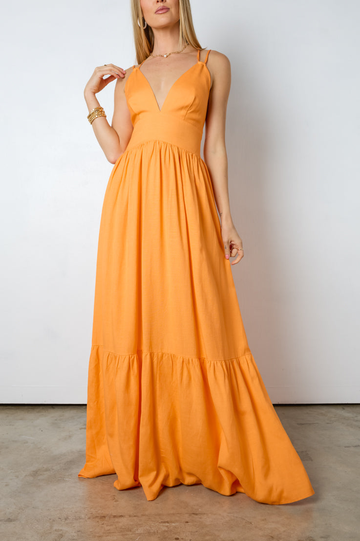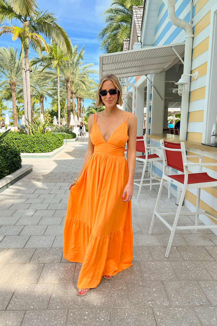 Esalta la tua dea interiore con questo splendido abito lungo Diana. Brilla al sole con la sua vibrante tonalità arancione, la profonda scollatura a V e la gonna fluida e lusinghiera. Completa il tuo look con sandali o tacchi per un look femminile perfetto per la primavera e l'estate. Sfoggia uno stile audace con questo abito sensazionale!