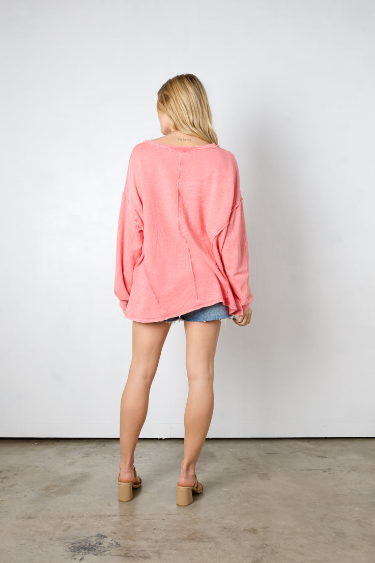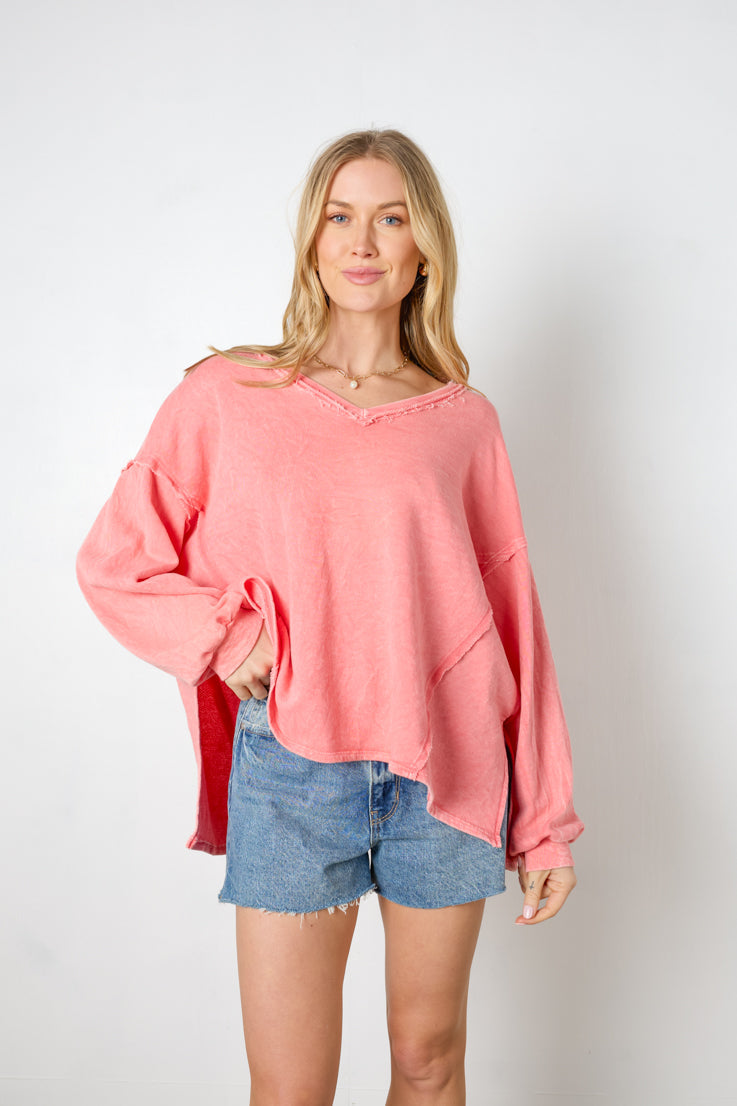Scopri il tuo capitolo preferito con questo caldo e accogliente top color corallo lavato. Con una vestibilità oversize, maniche lunghe, spalle scese e una profonda scollatura a V, vivrai una storia di stile e comfort. Il tessuto French Terry addolcisce ogni passo del viaggio. Mettiamoci comodi!