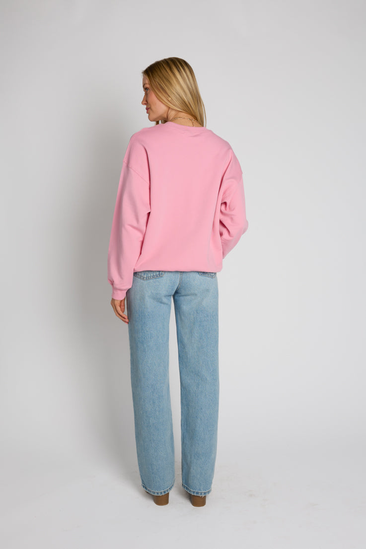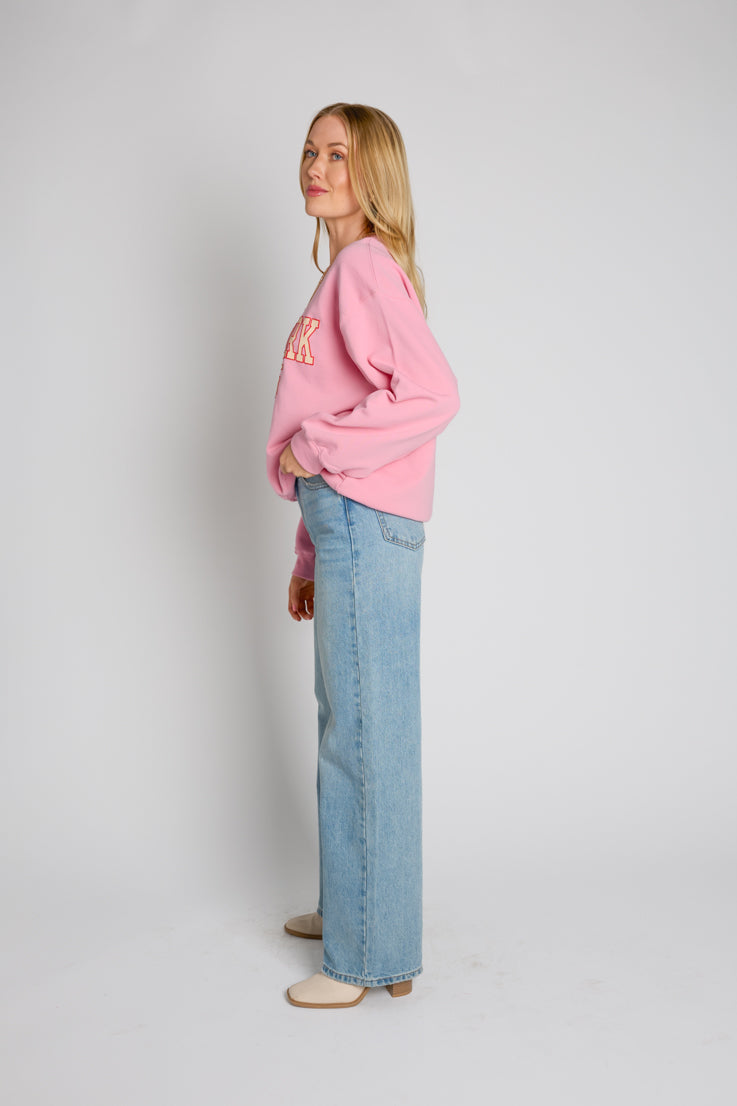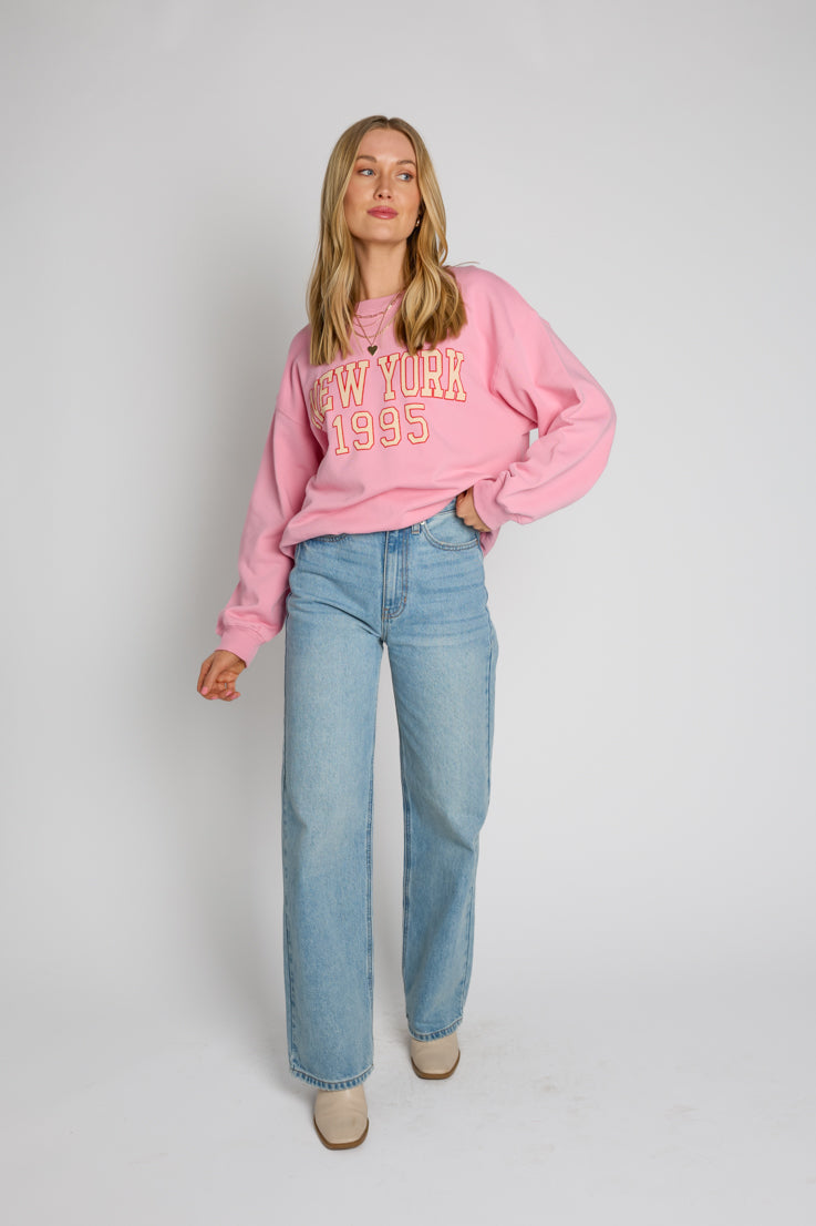 Questa felpa "Big City" è perfetta sia per chi ama la città che per chi aspira a diventare tale! Realizzata in tessuto rosa chiaro, presenta la scritta "New York 1995" in crema con contorno rosso: il modo perfetto per rappresentare la città che non dorme mai. Con la sua vestibilità ampia e oversize, le maniche lunghe ampie, le spalle scese e lo scollo rotondo, ti farà sentire a tuo agio e pronta per la città. Scendi in strada con stile!