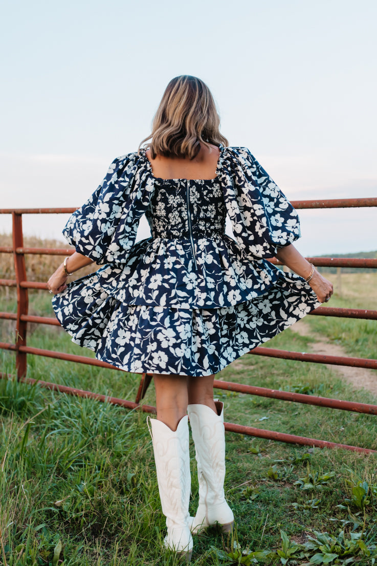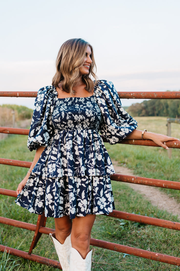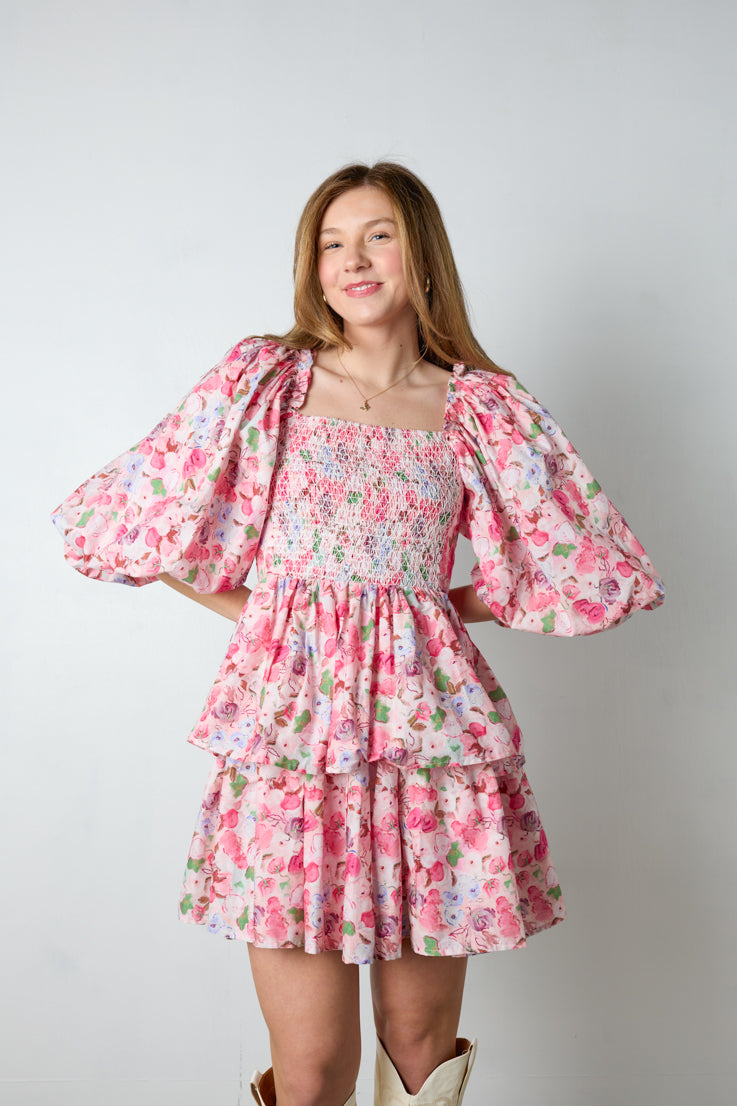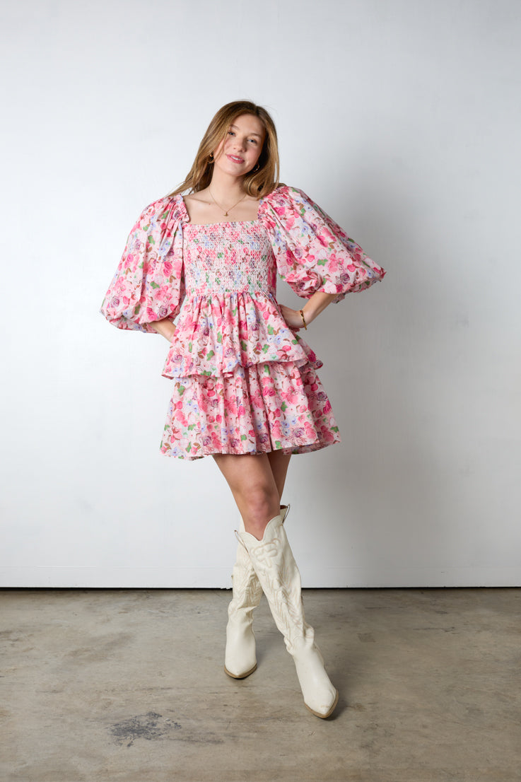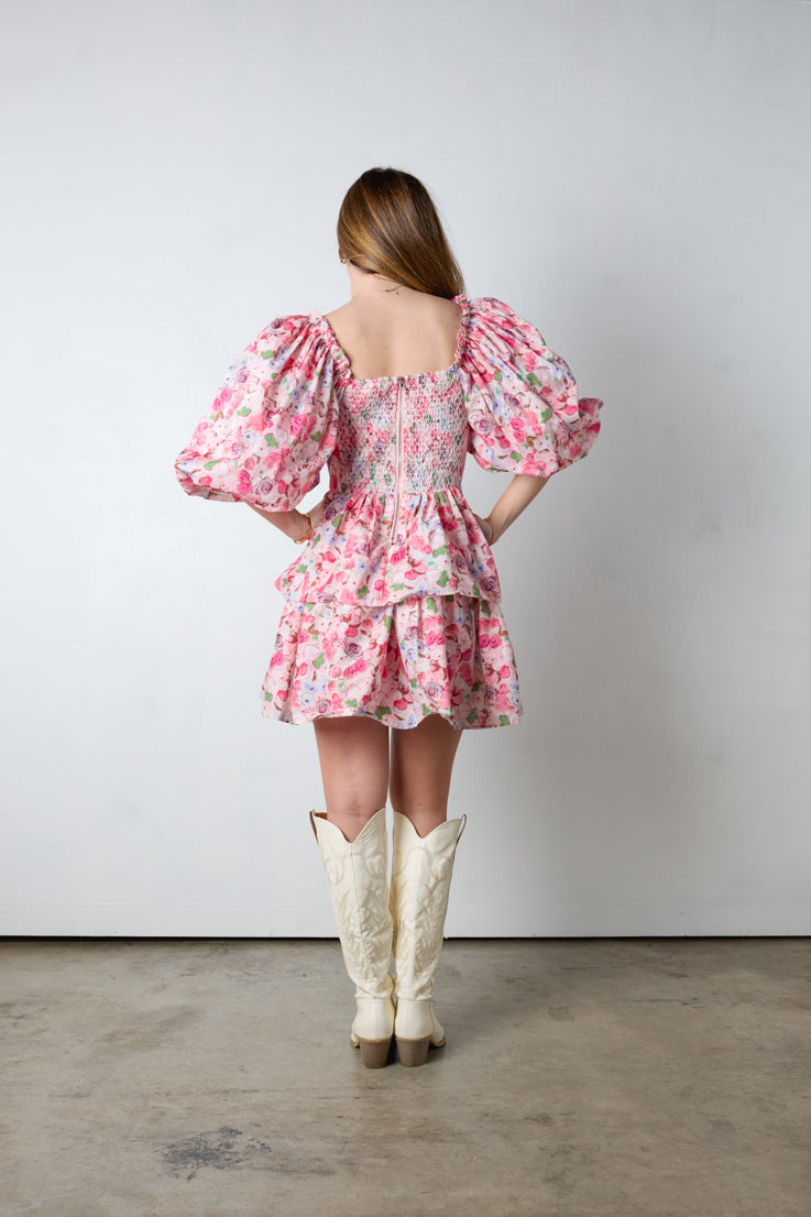 Sfoggia il tuo look migliore con questo splendido abito Marissa. Realizzato in uno splendido tessuto floreale, questo miniabito presenta un corpetto con arricciatura e maniche a palloncino a mezza lunghezza per un look sofisticato e disinvolto. La gonna a balze offre un tocco classico e raffinato. Perfetto per un look elegante o casual.