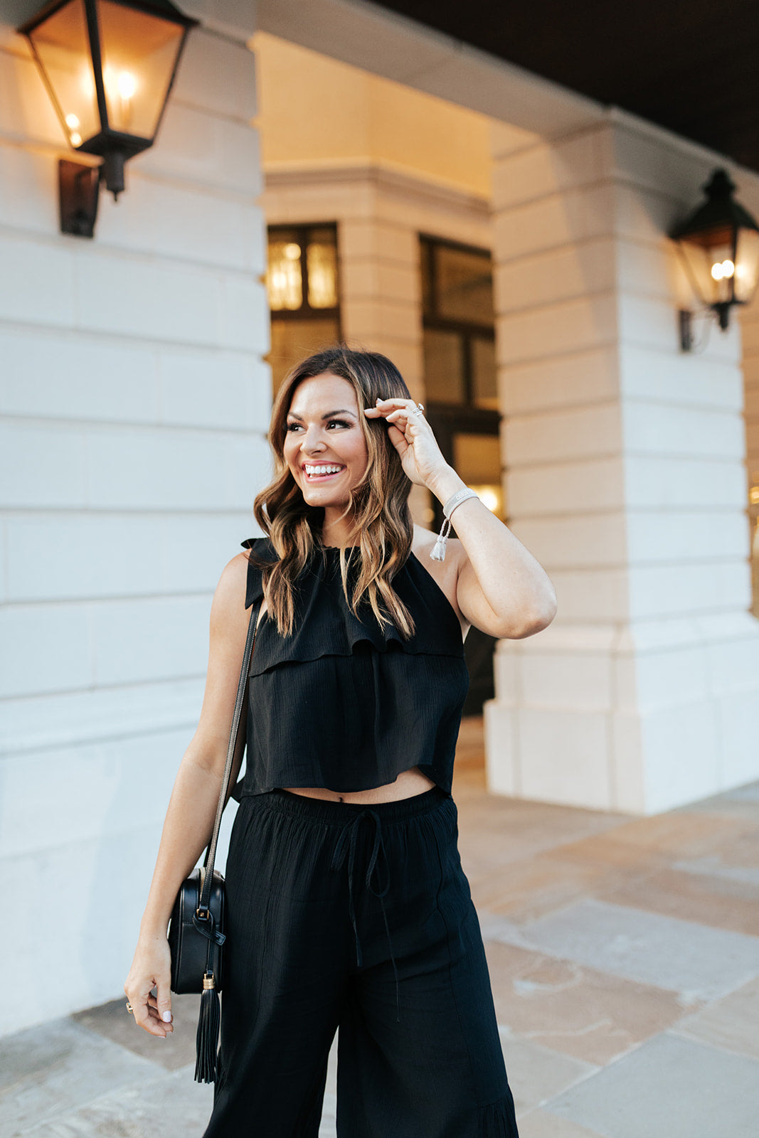 Vivi secondo il sole ma ama secondo la luna con questo top nero con volant. Presenta uno scollo all'americana con volant a balze sul davanti e una vestibilità corta. Abbinalo al nostro set By The Moon - Pantaloni per un outfit mozzafiato. È il completo perfetto per la tua prossima vacanza o per le serate in città.