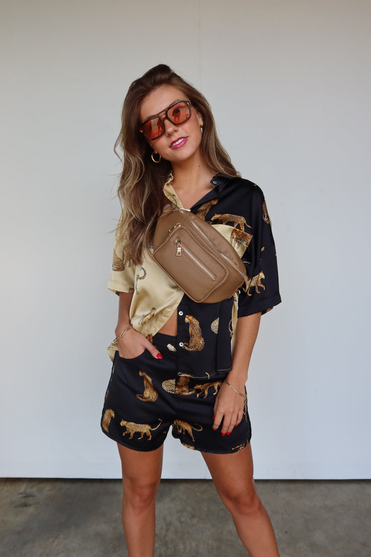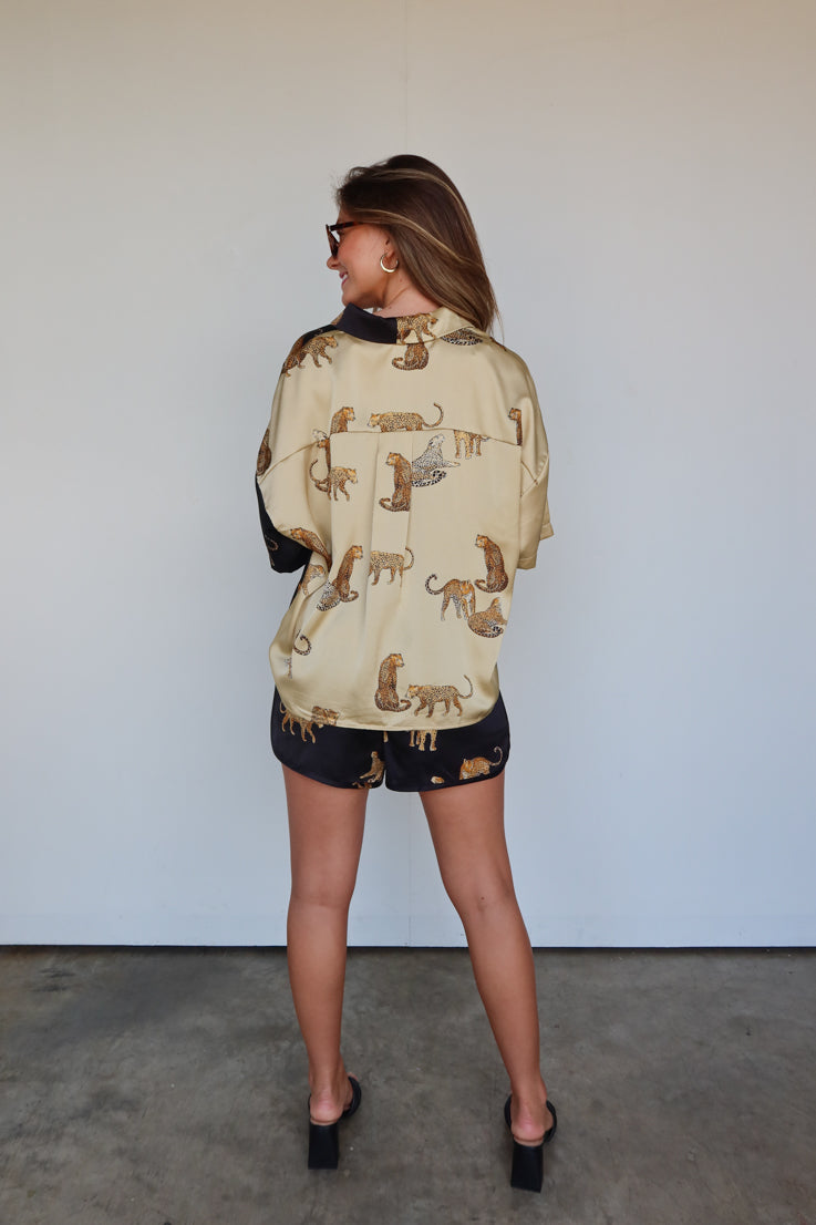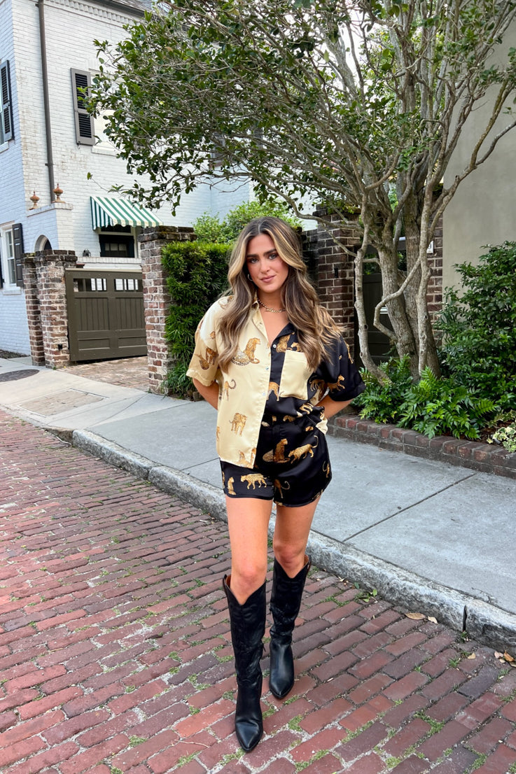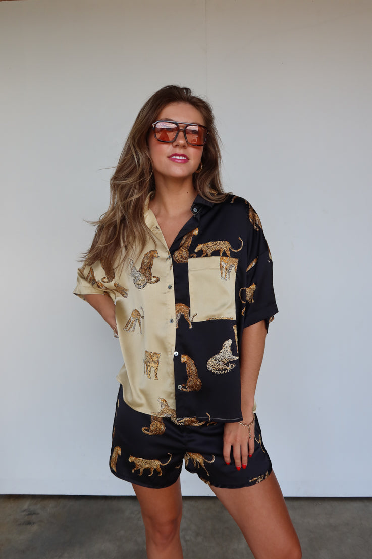 Questa trendy stampa leopardata bicolore sembra sempre andare a ruba, e capiamo perché! Amiamo la versatilità di questa camicia a maniche corte in seta e il contrasto bicolore nero e avorio. Si abbina perfettamente a shorts coordinati o a un paio di jeans e sneakers.