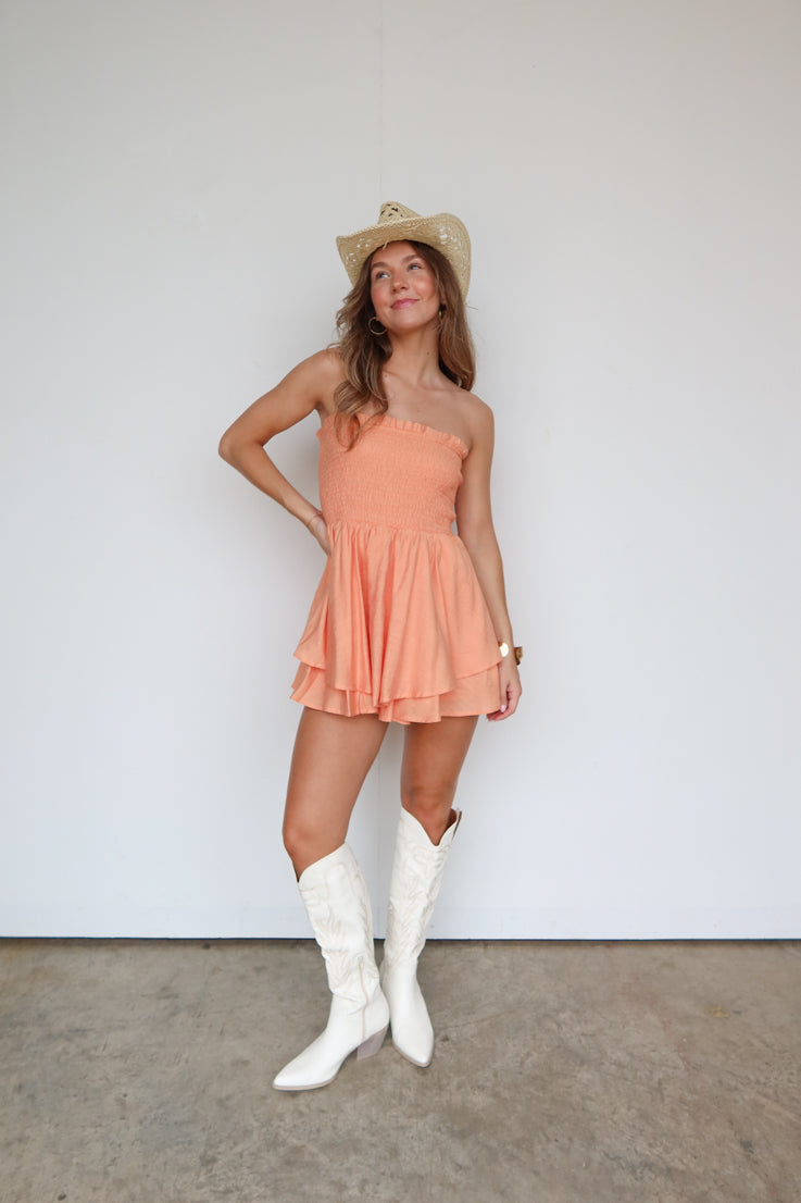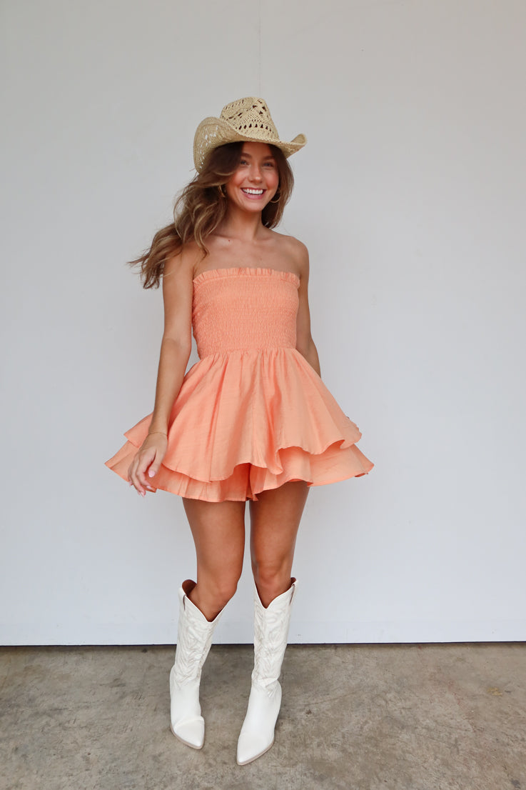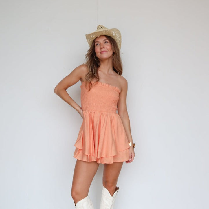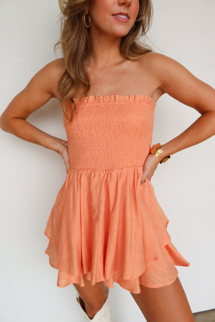 Aggiungi un tocco di colore al tuo guardaroba con questo miniabito color pesca. Ha una silhouette senza spalline con corpetto smock, gonna fluida a balze e shorts integrati. Perfetto per l'uso quotidiano, si abbina a qualsiasi capo, dai tacchi alle sneakers.