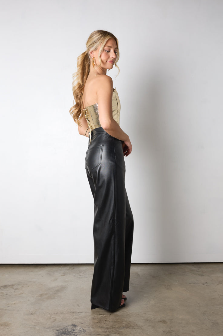 Diventa la star di ogni spettacolo con il corsetto Golden Era. Questo top corsetto in pelle vegana con allacciatura sulla schiena non passerà inosservato. Preparati a brillare più del sole! Non vorrai perderti questo pezzo sensazionale: è oro puro!
