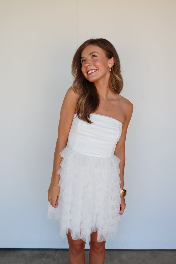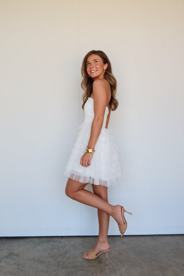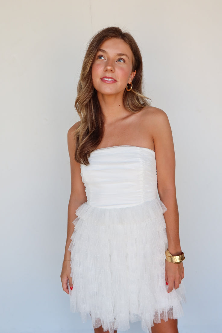 Lasciati conquistare dall'amore con questo splendido miniabito bianco. Ha una silhouette senza spalline con gonna a balze a balze e corpetto arricciato. Il tessuto presenta un delicato motivo a pois bianchi. Perfetto per la futura sposa per il tuo addio al nubilato o addio al nubilato. Abbinalo a tacchi e accessori dorati a strati.