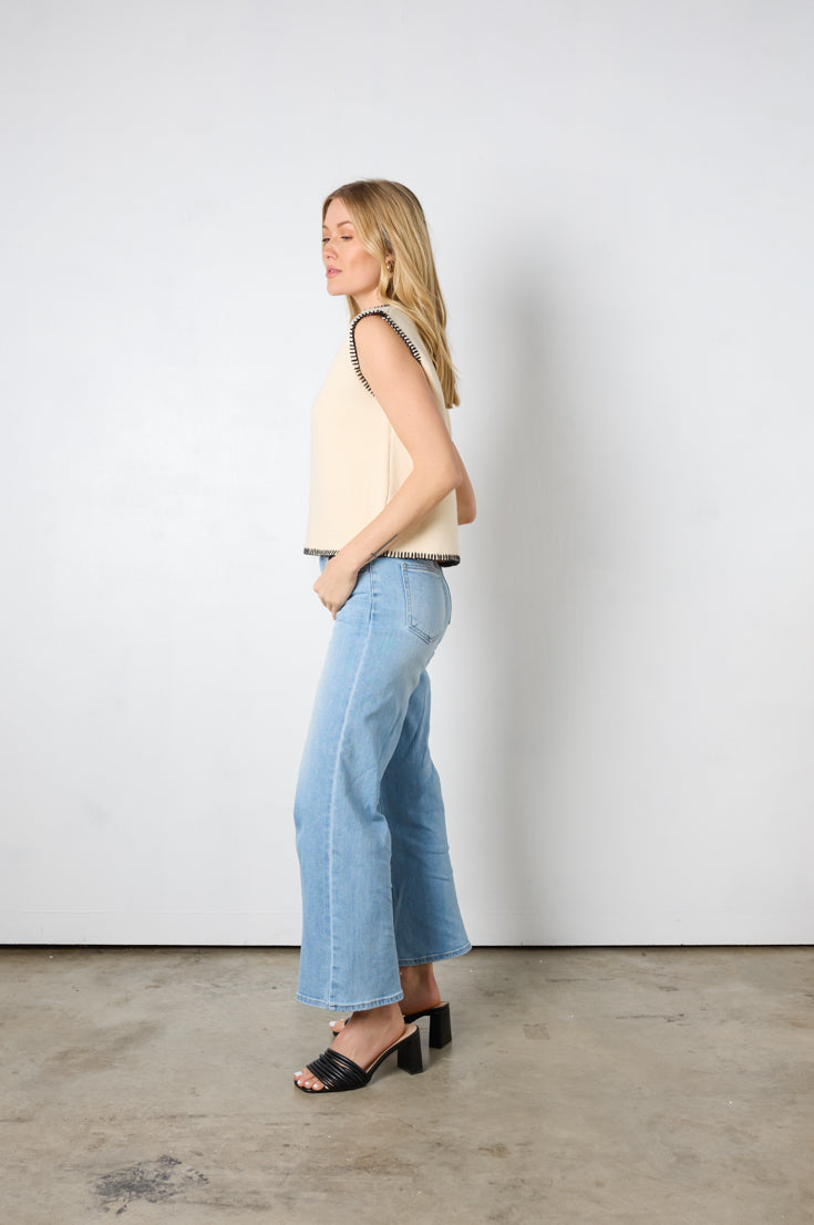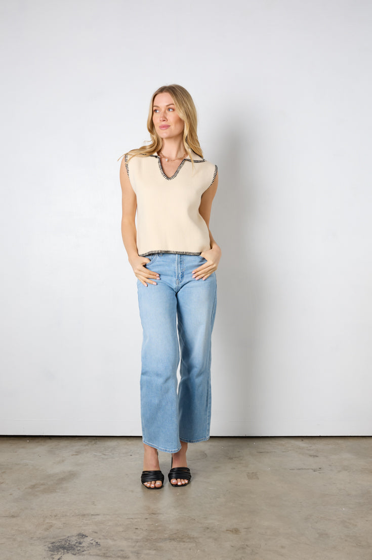 Sii audace e non andare sul sicuro con il gilet Dynamic Duo! Questo top beige senza maniche presenta cuciture a contrasto nere e una scollatura con colletto per un tocco di stile. Indossalo con qualsiasi pantalone e sarai pronta ad affrontare la primavera con stile. È un capo versatile che ti donerà un look dinamico!