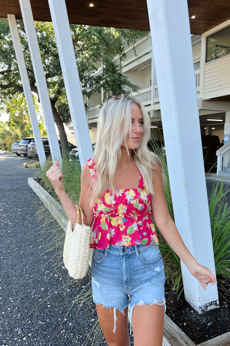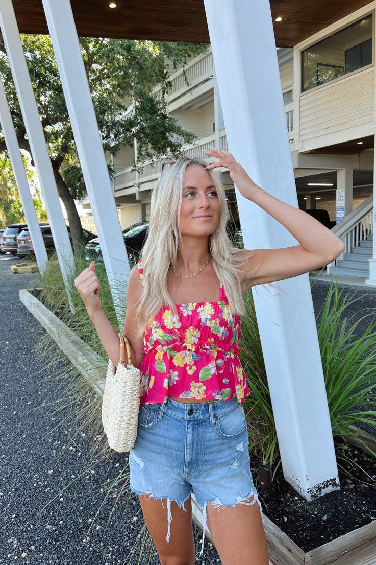 Questo top rosa shocking è perfetto per quei giorni in cui ti senti frizzante e scintillante! Con una vivace stampa floreale, spalline arricciate, corpetto smock e silhouette a canotta, sembrerai una dea ardente. Completa il look abbinando il top a degli shorts in denim e scatenati!