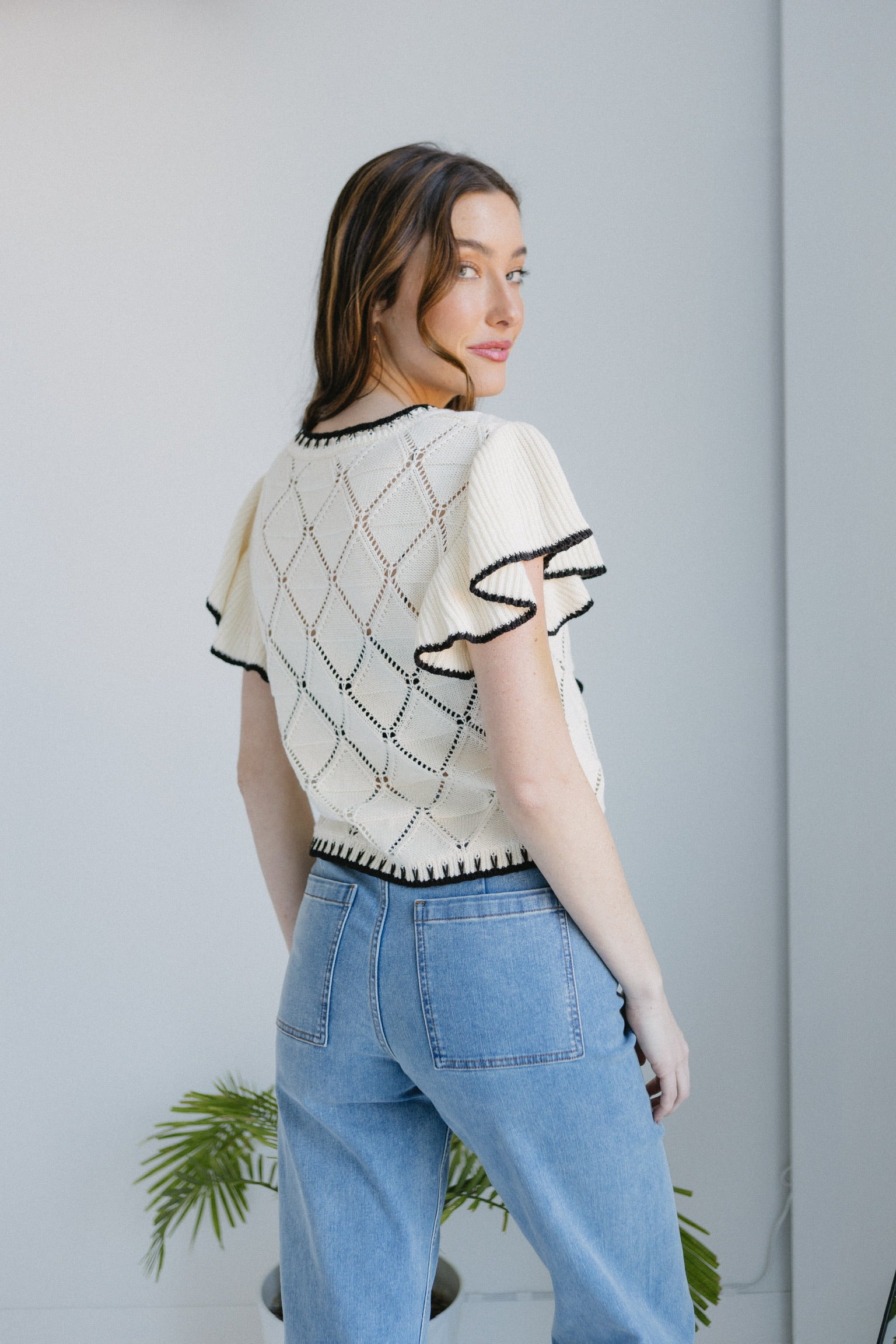 • Top in maglia color crema con finiture a contrasto nere