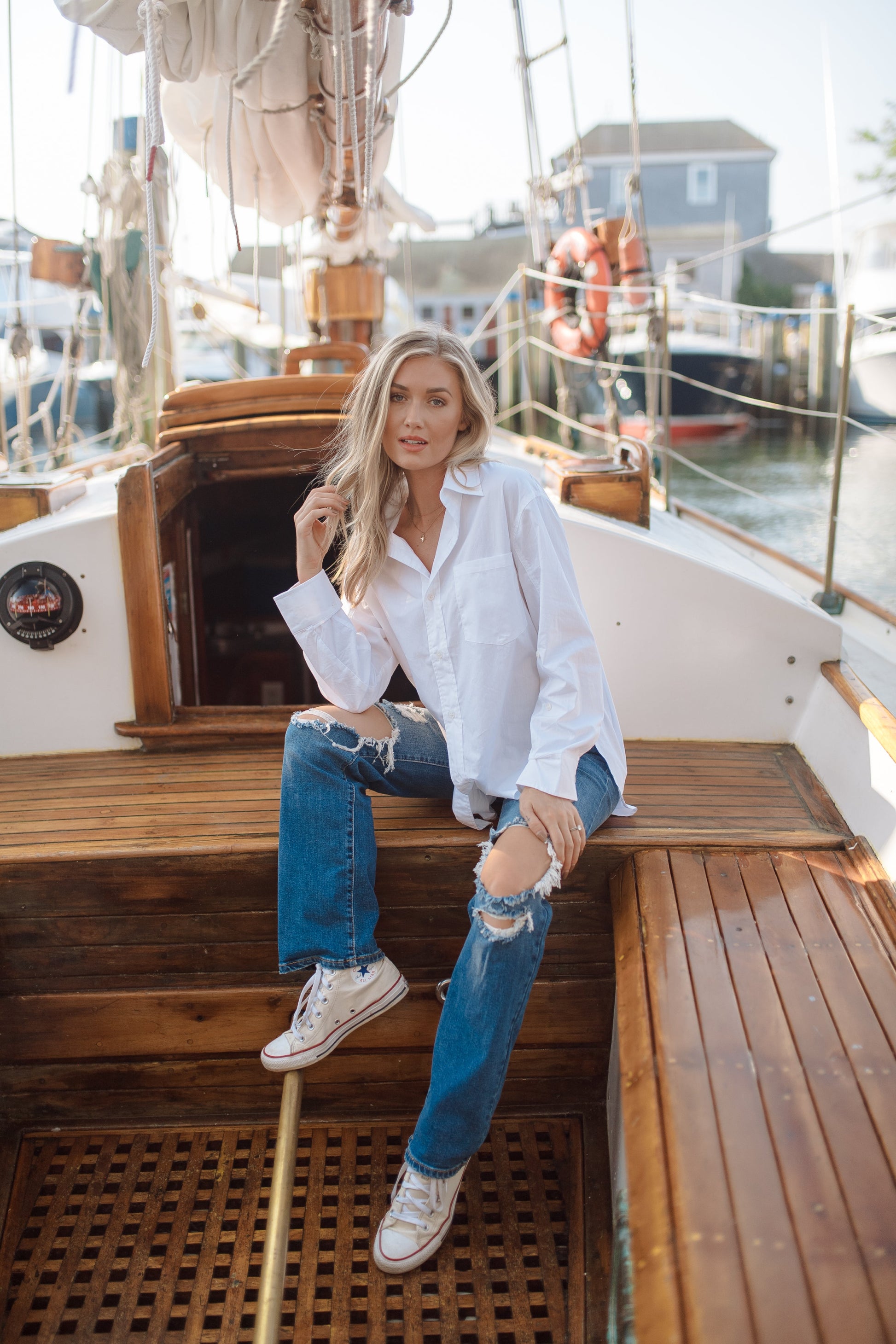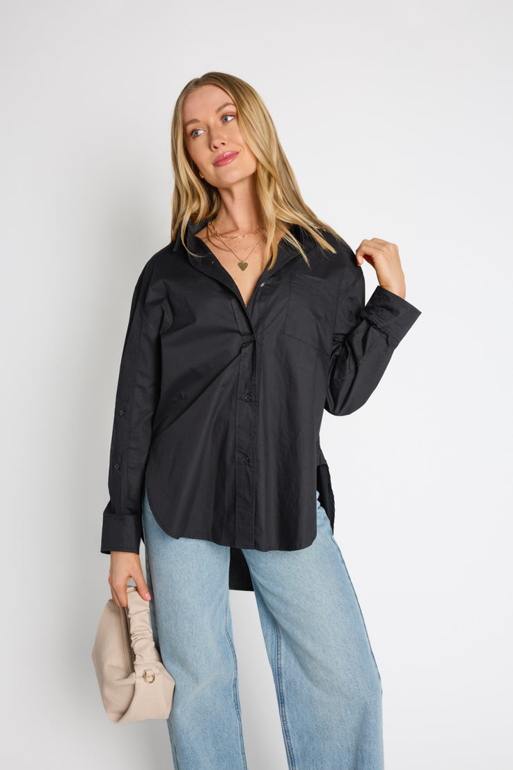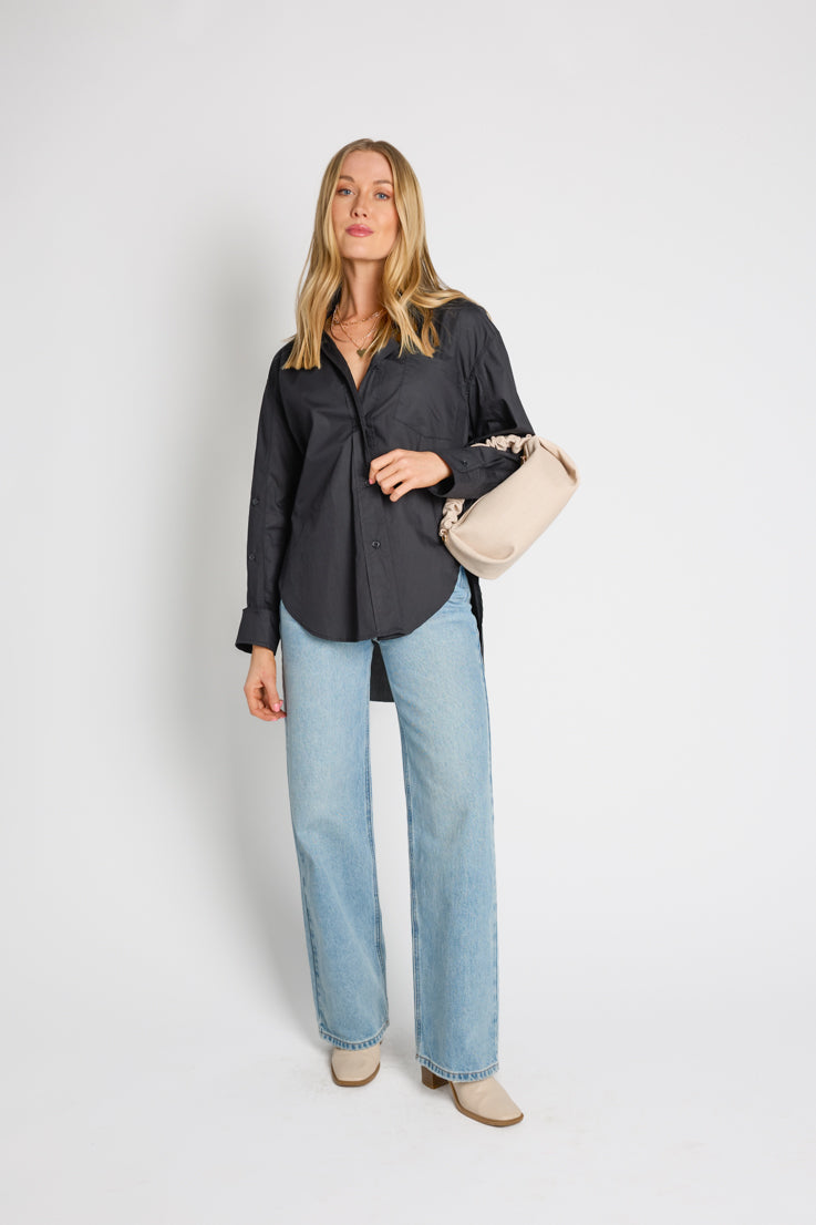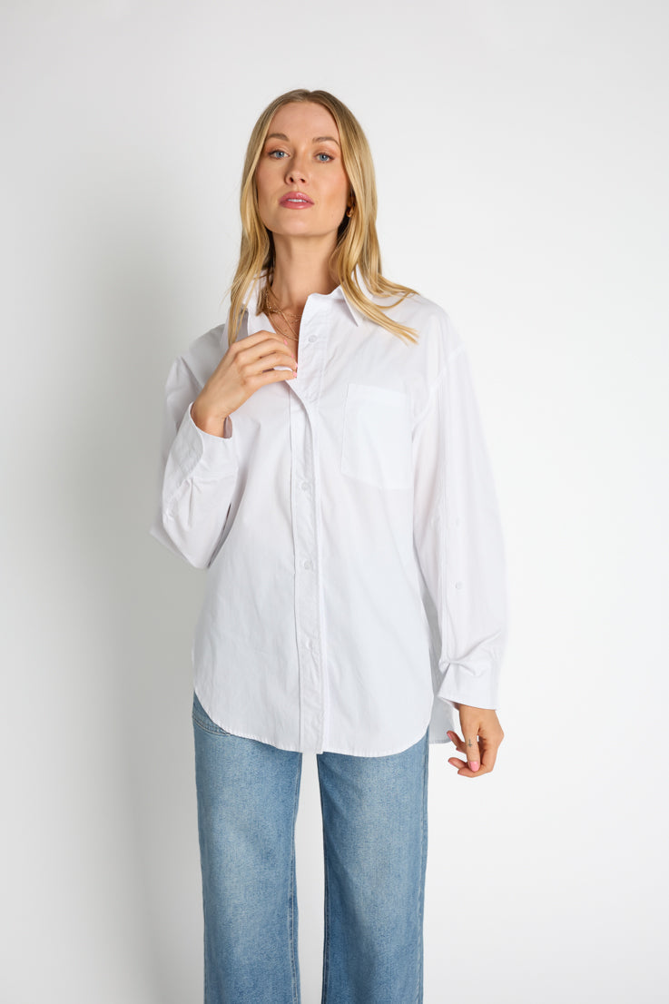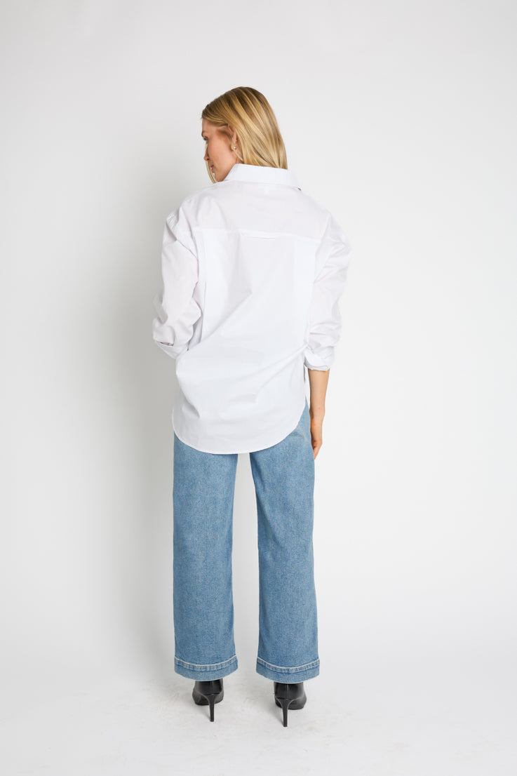 Questa blusa oversize è il capo perfetto per ogni stagione. La adoriamo sotto un gilet o da sola. Il top boyfriend per eccellenza di cui non potrai fare a meno quest'anno, disponibile in tre fantastici colori: azzurro, nero classico o bianco candido.