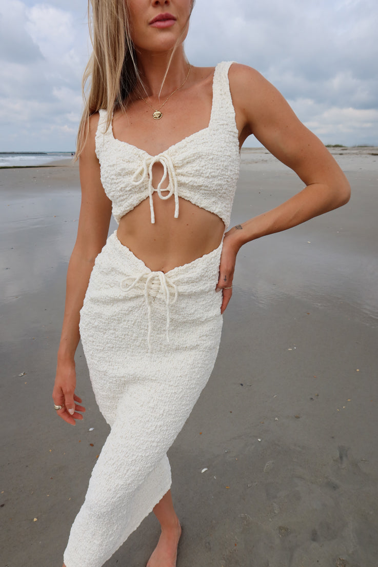 Questo splendido abito Riviera presenta una silhouette midi color avorio con un elegante taglio sul davanti e lacci al seno e in vita. Il suo design versatile è diverso da qualsiasi cosa abbiamo mai visto prima. Questo capo sarebbe splendido per una luna di miele o per chiunque vada in vacanza ai tropici questa primavera o estate! Si abbina bene a sandali con cinturino e gioielli dorati!