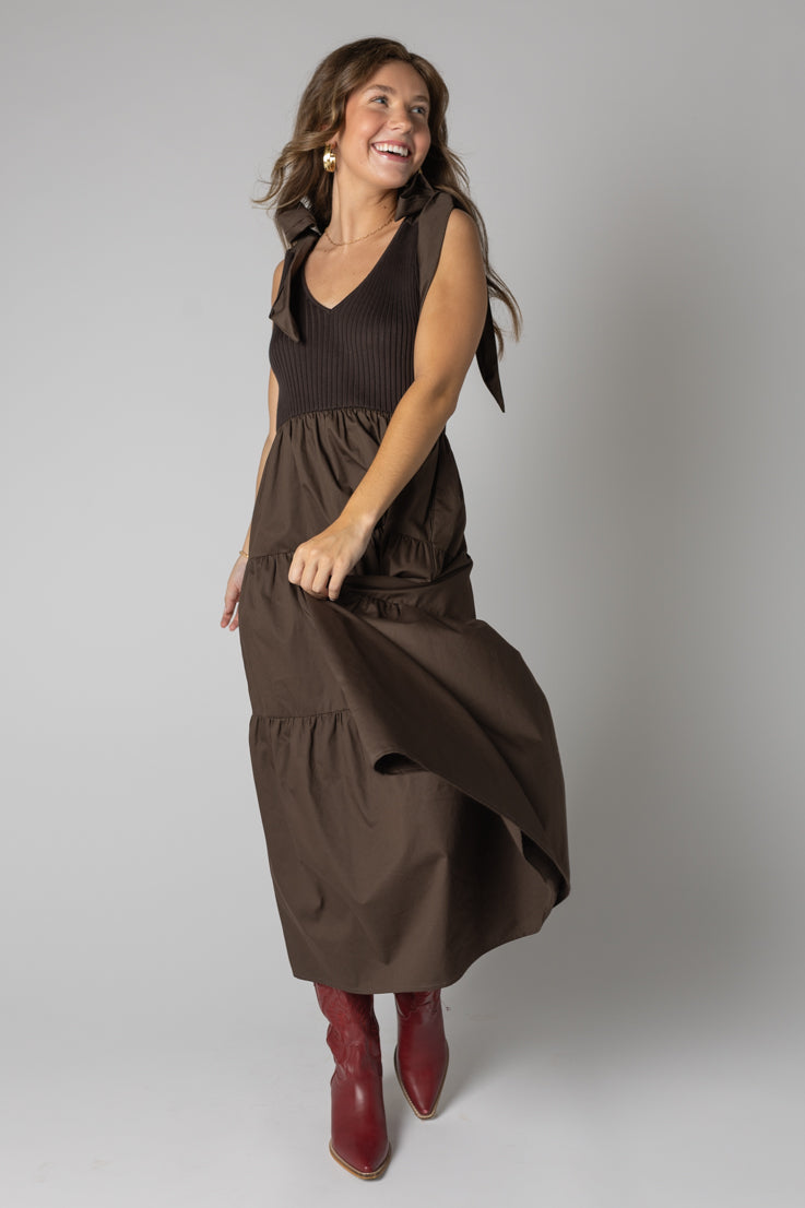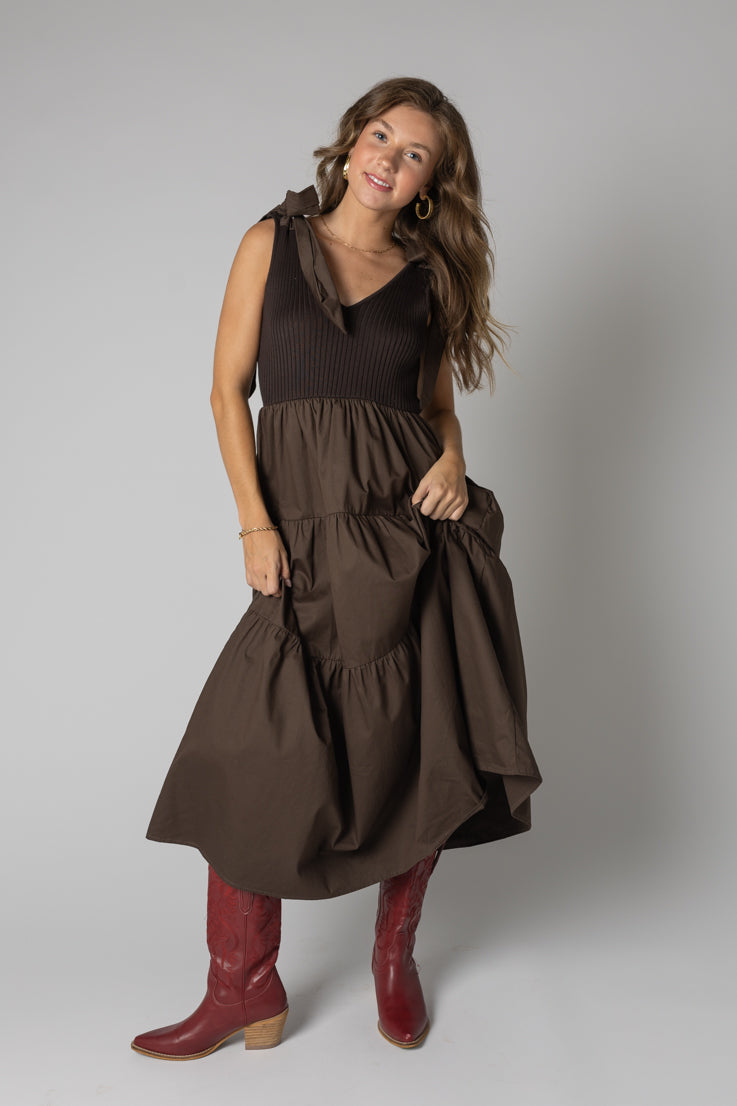 È arrivato l'abito autunnale perfetto. L'abito Sienna vanta una splendida tonalità verde oliva e una scollatura a V che valorizza la figura. Con una gonna a balze e spalline spesse che si annodano sulle spalle, questo abito è la combinazione perfetta di stile e comfort. Abbinalo a tacchi o stivaletti color carne per un look perfetto.